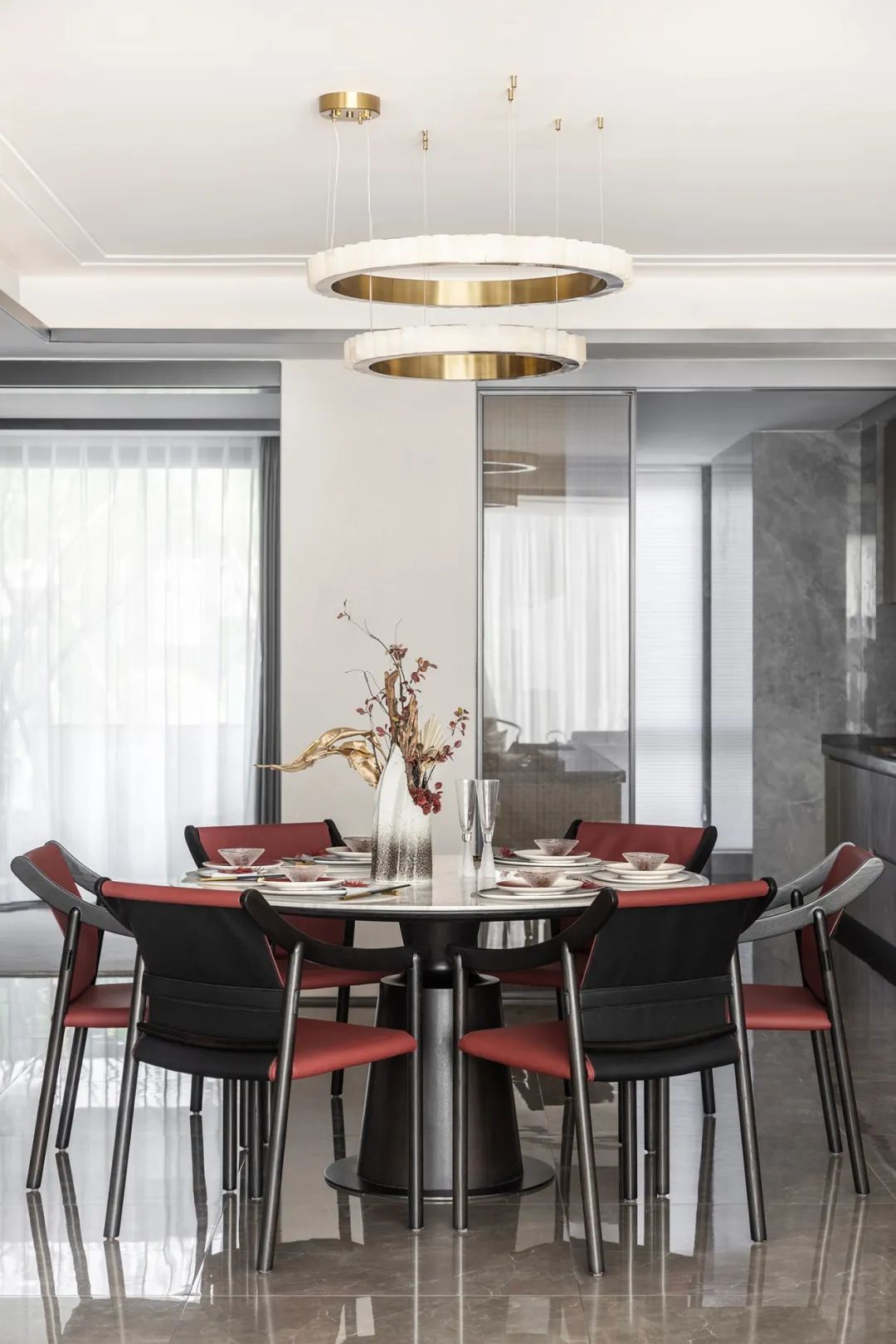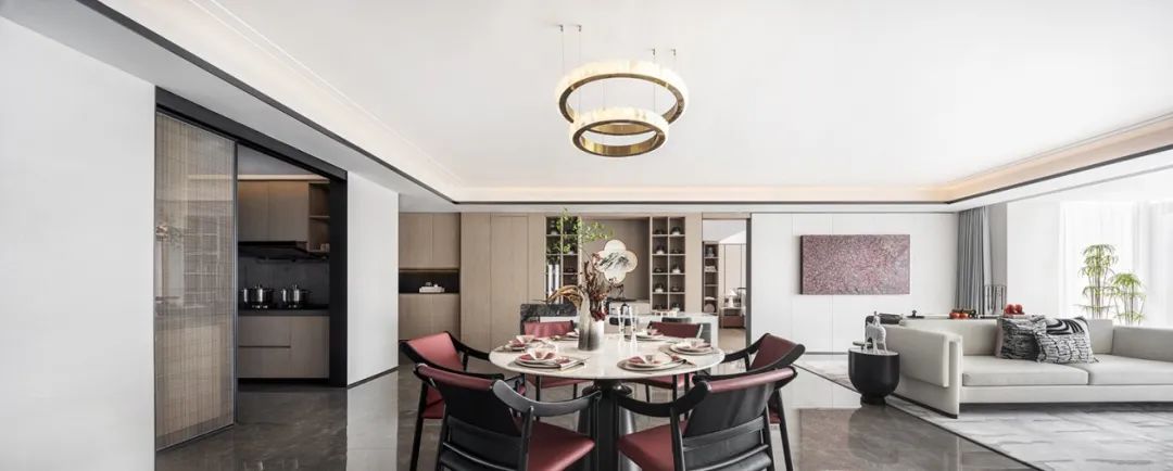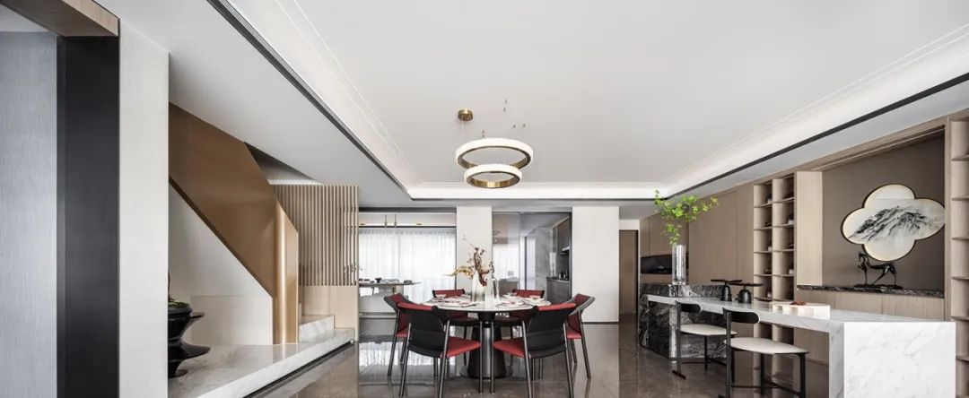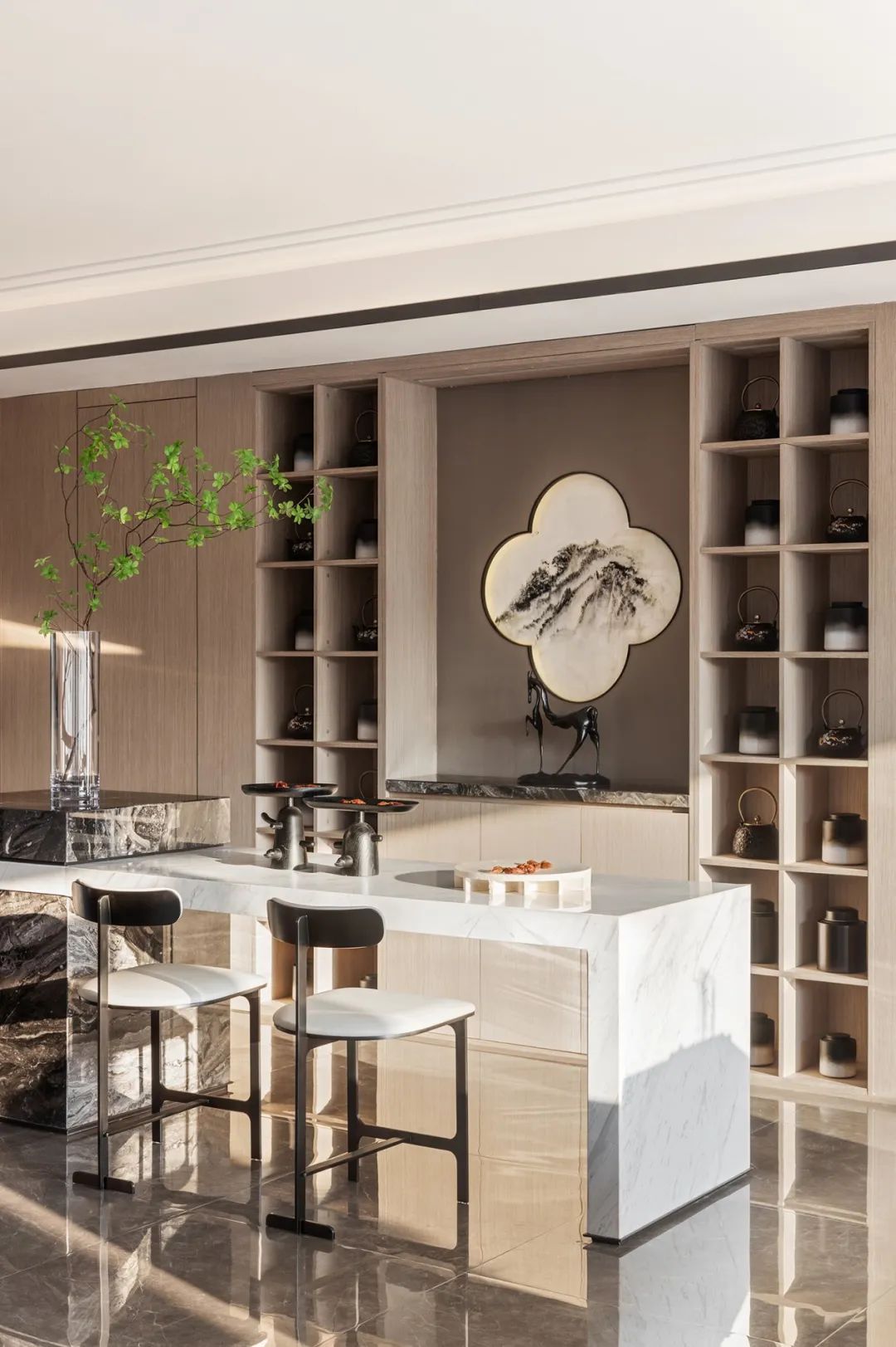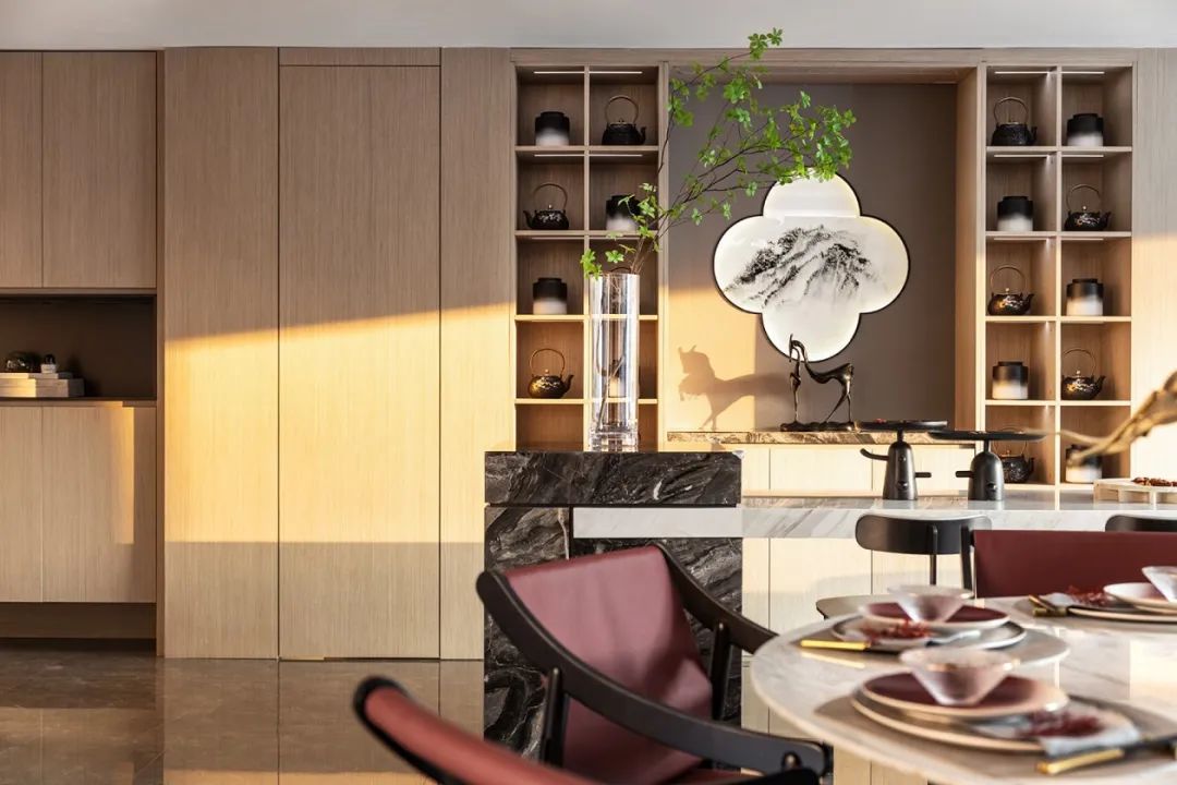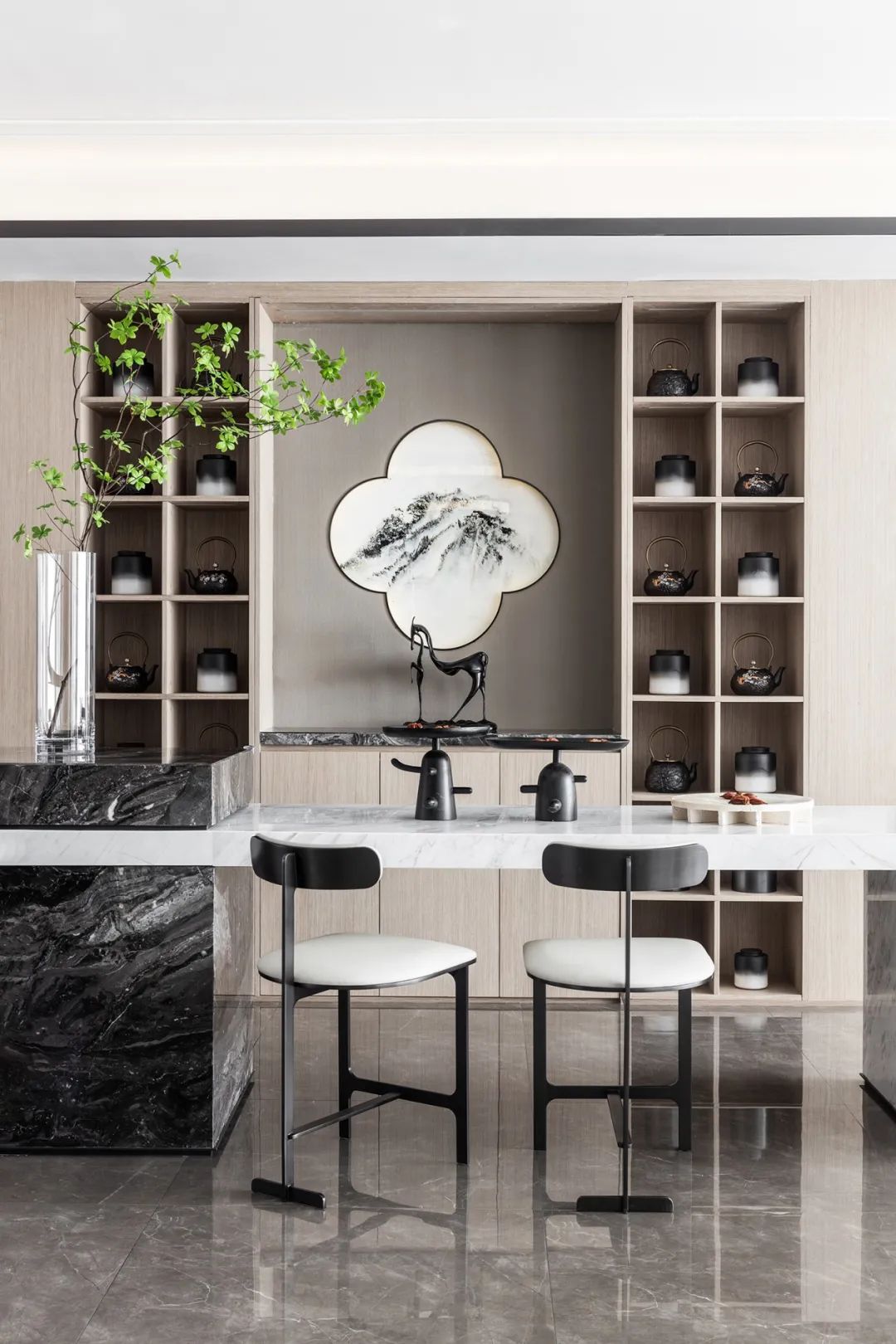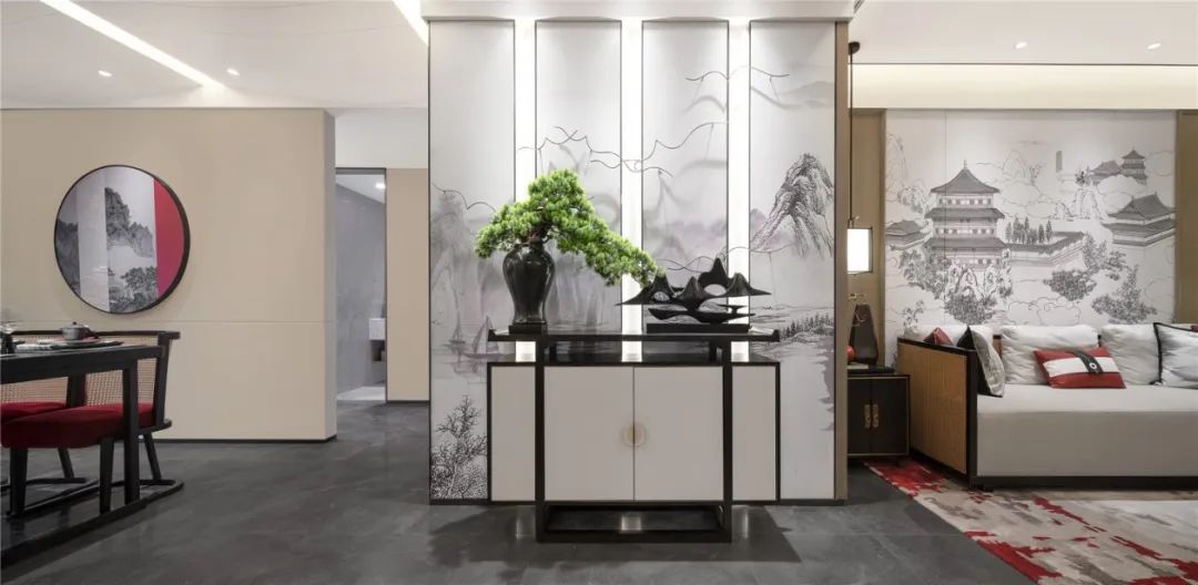 同時也可以利用隔斷本身的形狀、材質、色彩、圖案等提升空間本身的韻味。在新中式中,屏風、博古架等傳統(tǒng)中式元素也被沿襲,給空間帶來多重層次感。