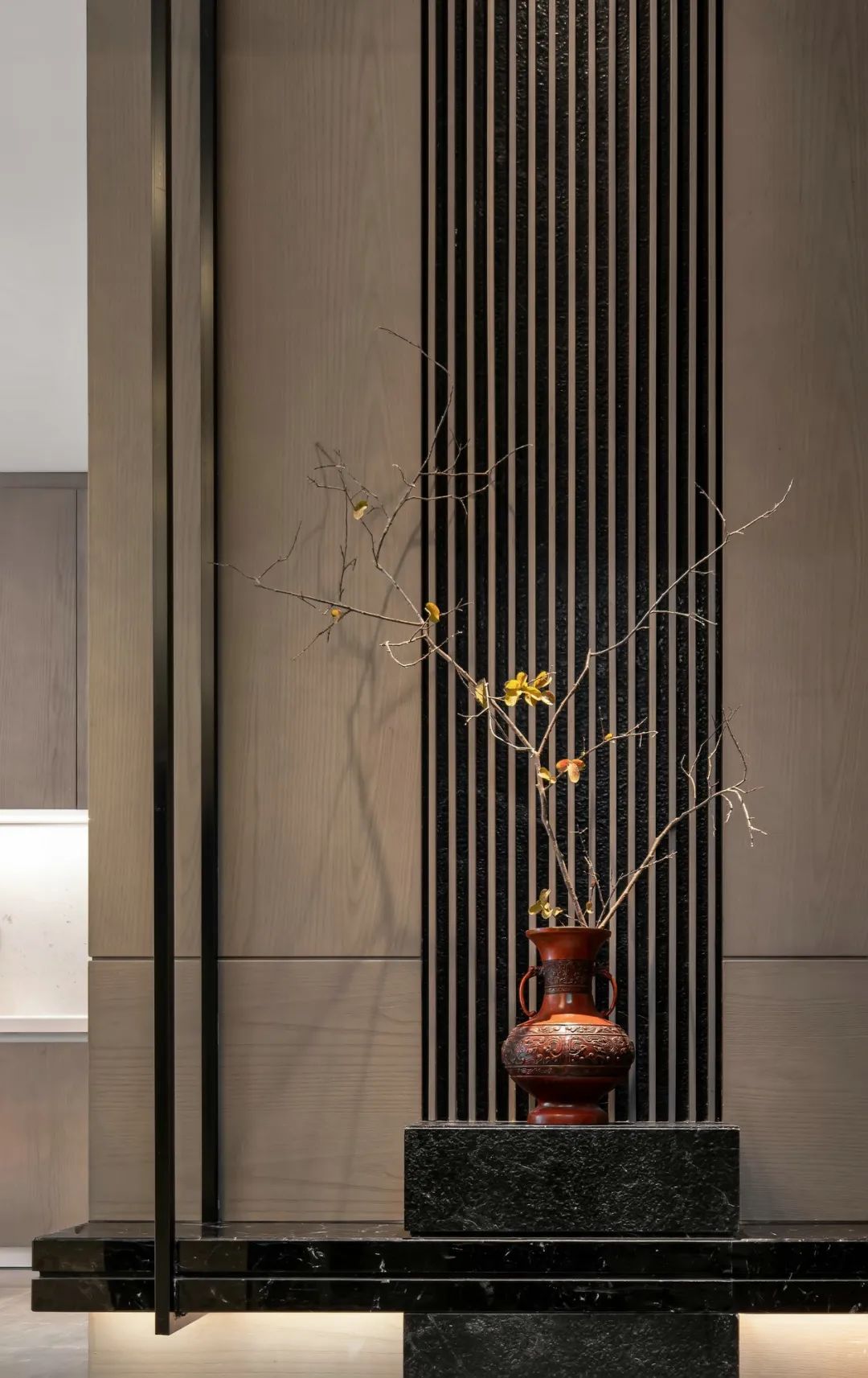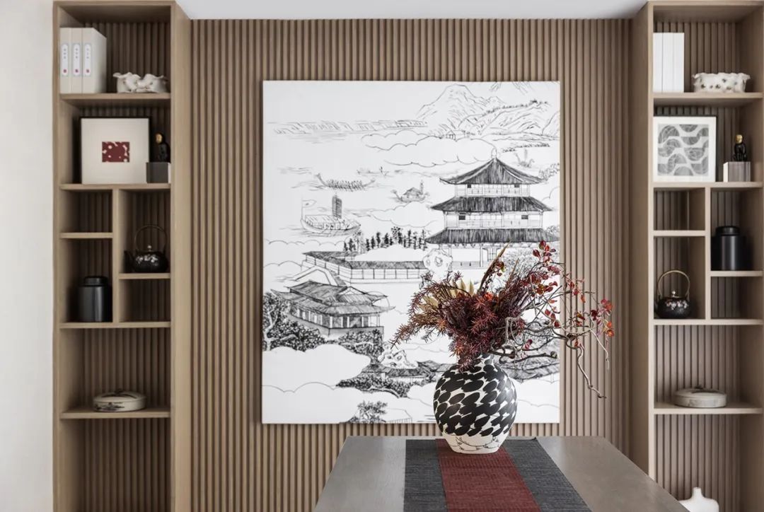 在新中式設計中,應用大面積留白來凸顯個別家具或裝飾。像國畫一樣構造清雅空靈的氛圍,引發(fā)人的遐想,以此打造空間的質感和美感。