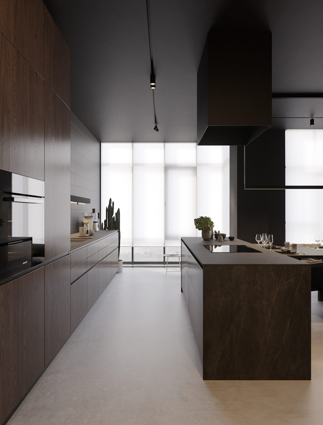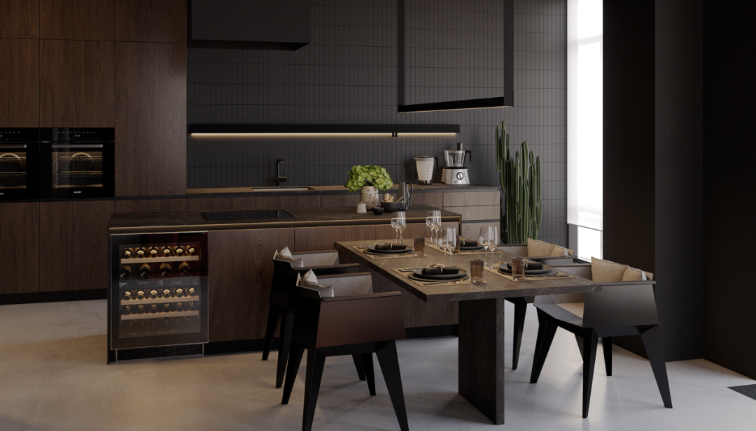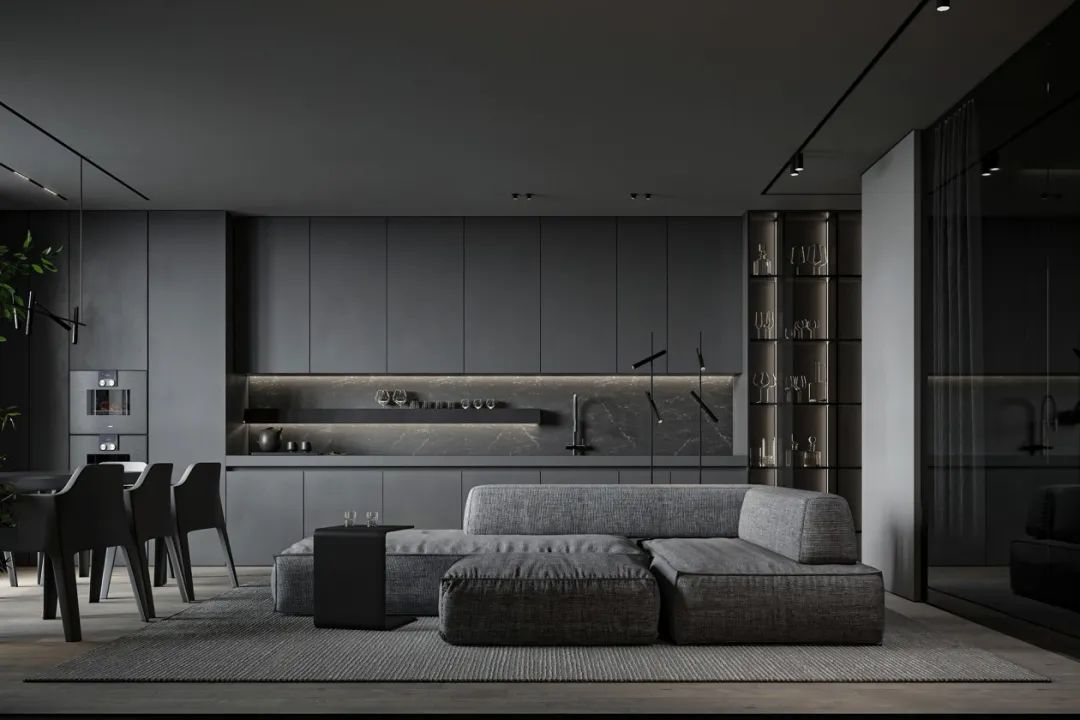高級(jí)灰的色調(diào)寧謐柔和,在自然光下呈現(xiàn)微妙細(xì)膩?zhàn)兓?。開(kāi)放式的布局,木色地板與廚房灰色面板形成對(duì)比,具有較好的協(xié)調(diào)性。