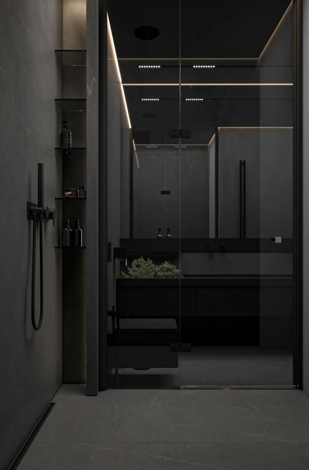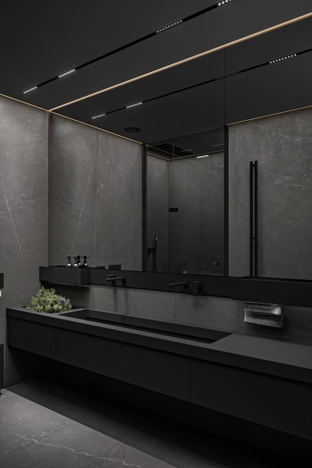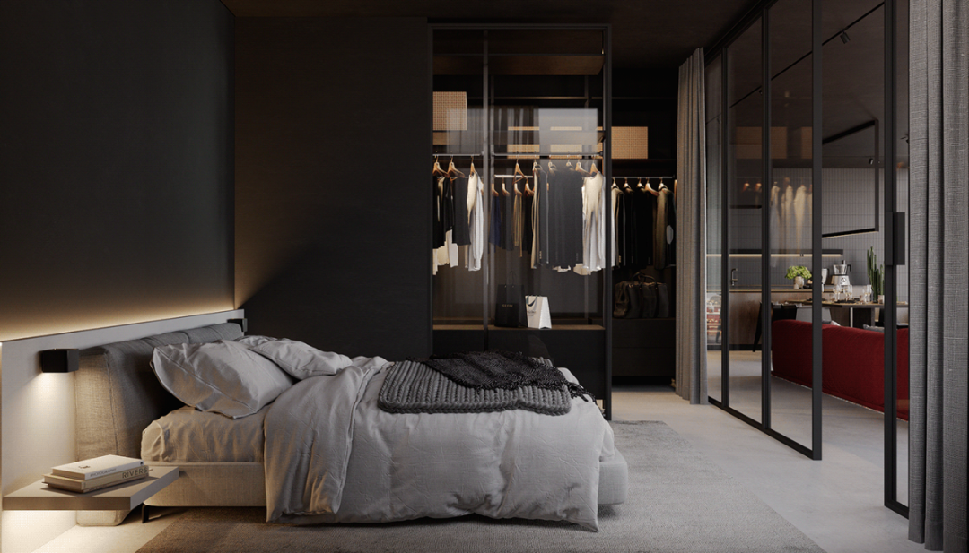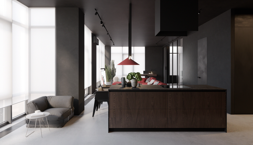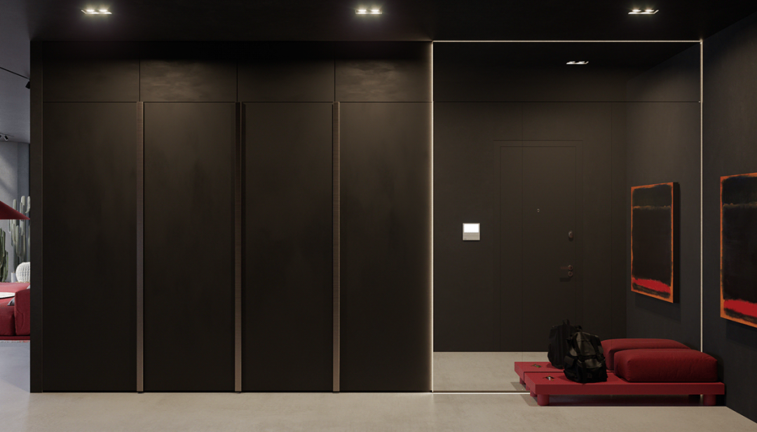 主體空間局部選用較明亮的紅色調(diào)動(dòng)深灰沉靜的氛圍,跳躍的色塊打破平淡的畫面,強(qiáng)化空間層次感。
