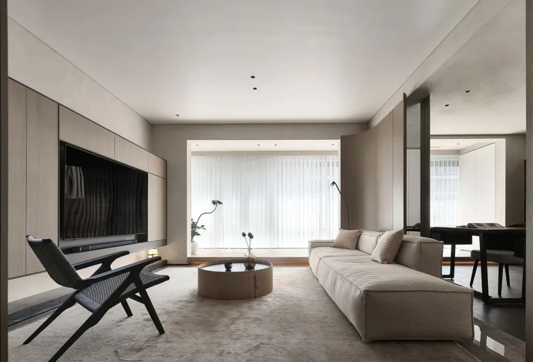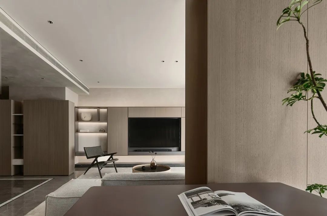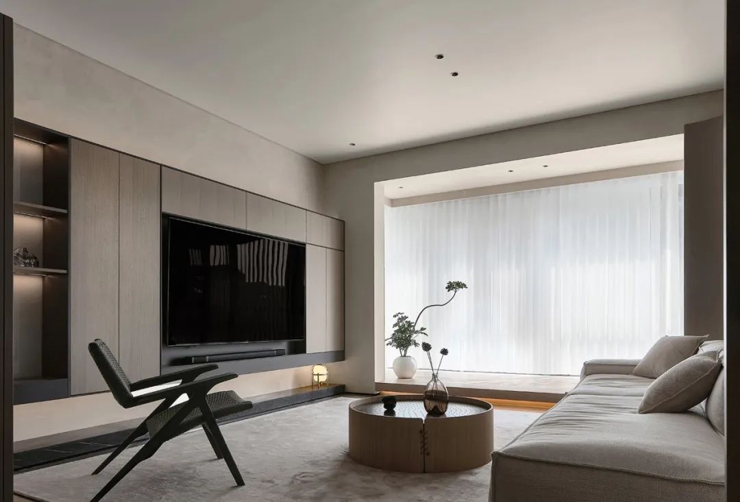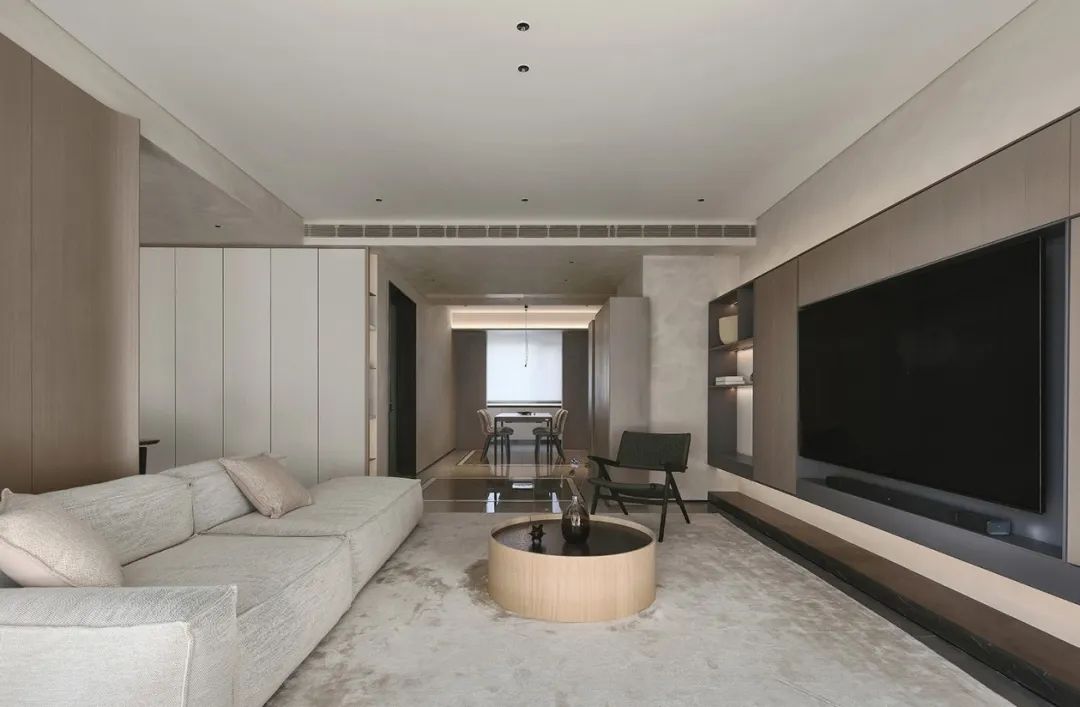 沙發(fā)背景的那一面是弧形,相較于直線表達(dá),可以更好的遮擋住T型剪力墻,也對沙發(fā)位置產(chǎn)生包裹感,極富動(dòng)勢。