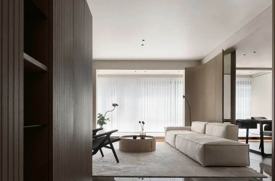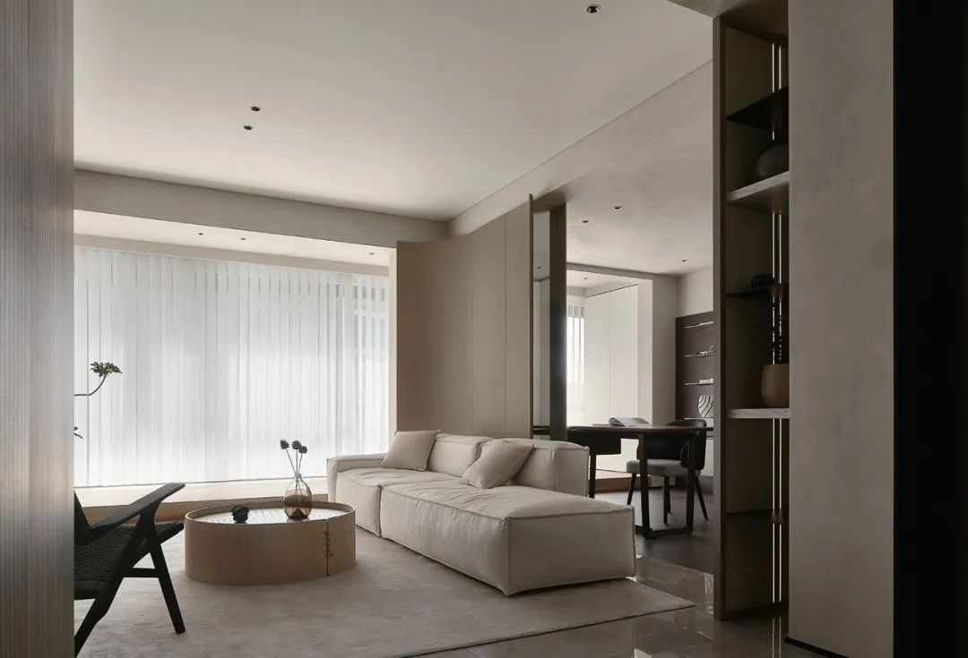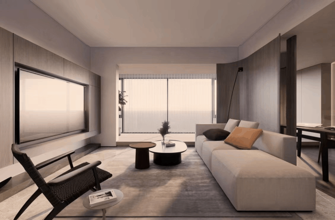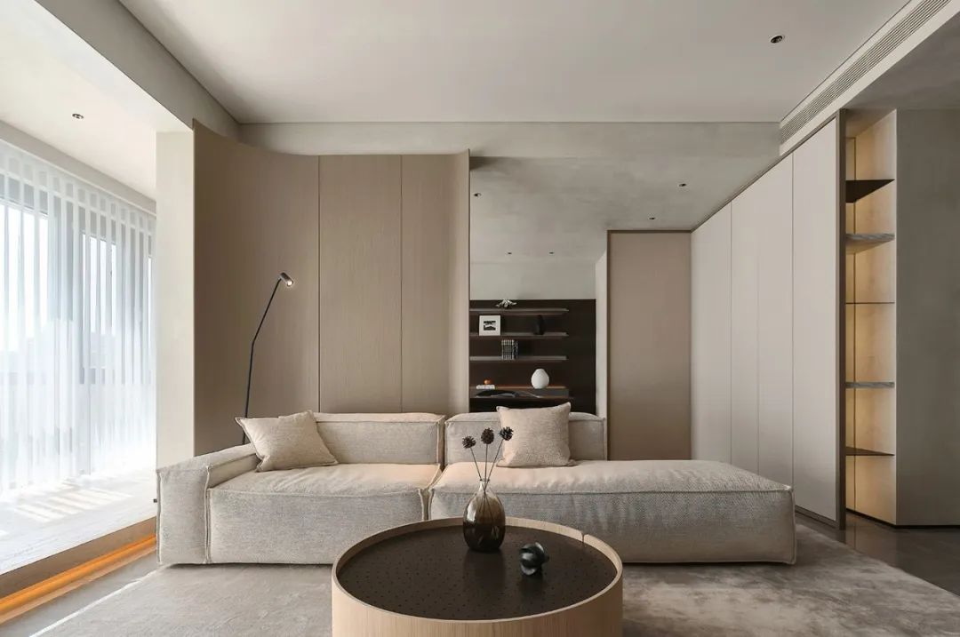 沙發(fā)背景的那一面是弧形,相較于直線表達(dá),可以更好的遮擋住T型剪力墻,也對沙發(fā)位置產(chǎn)生包裹感,極富動(dòng)勢。