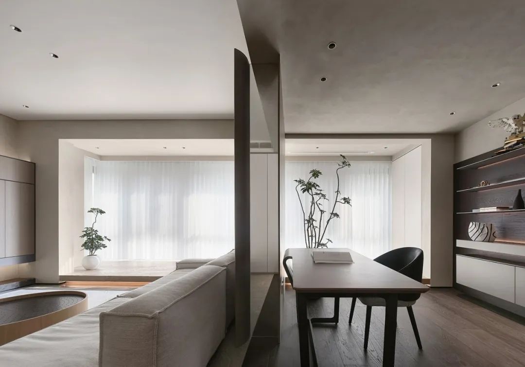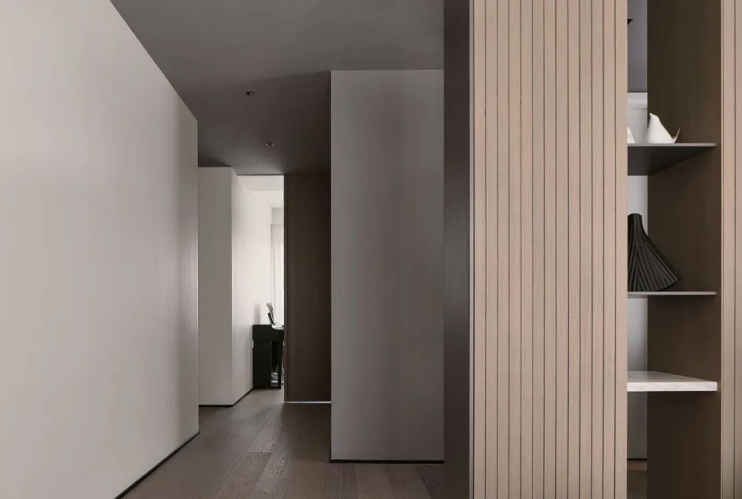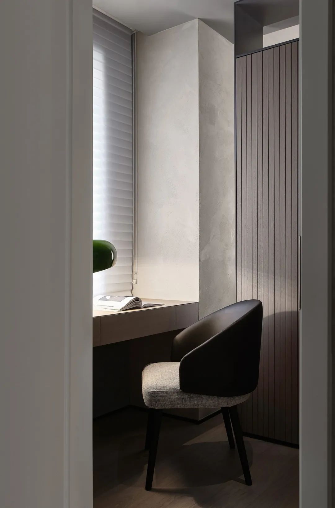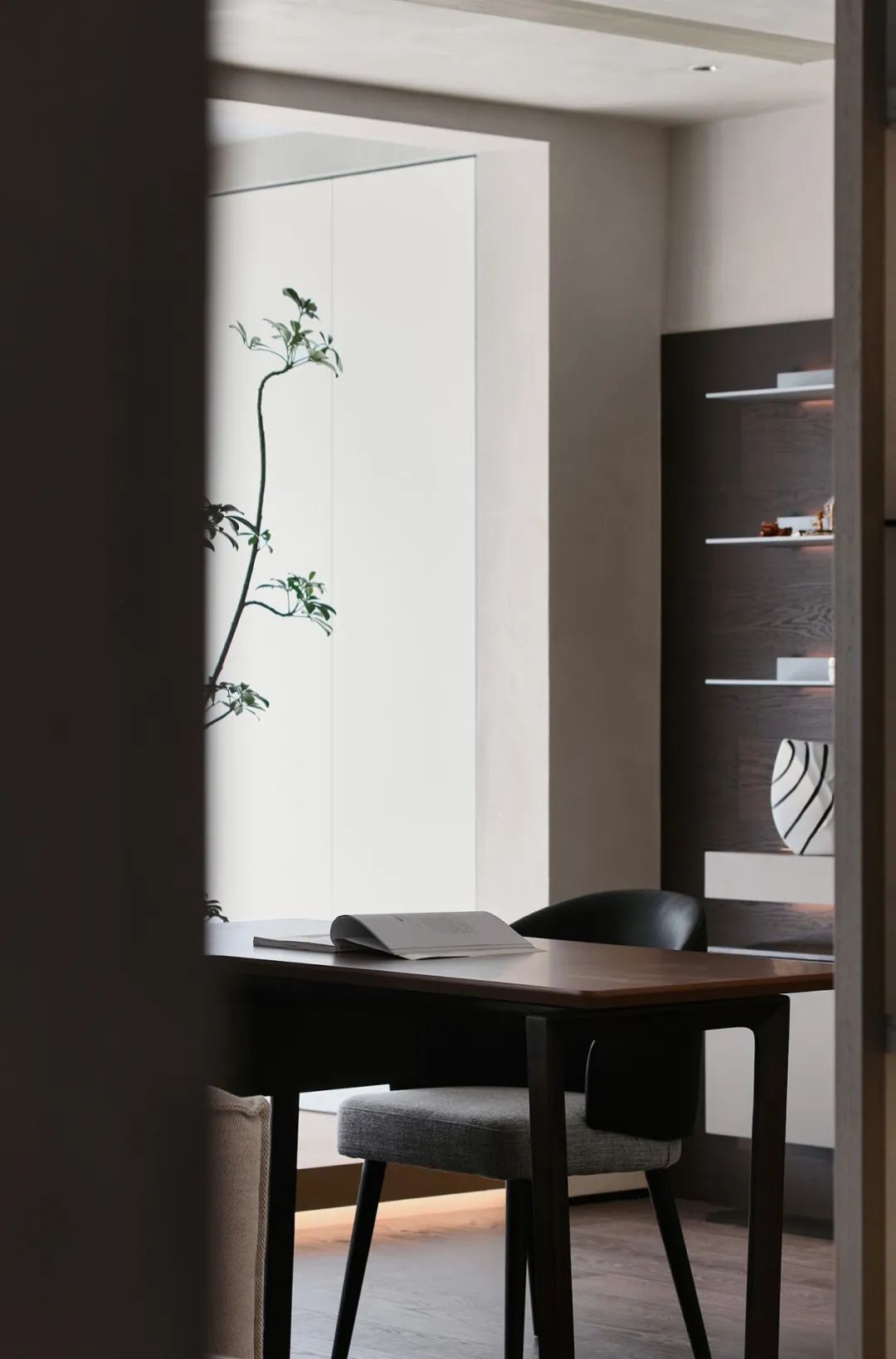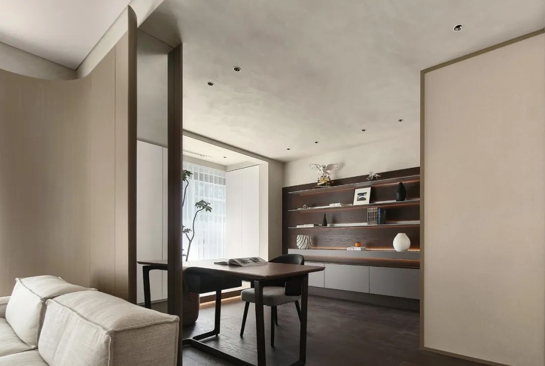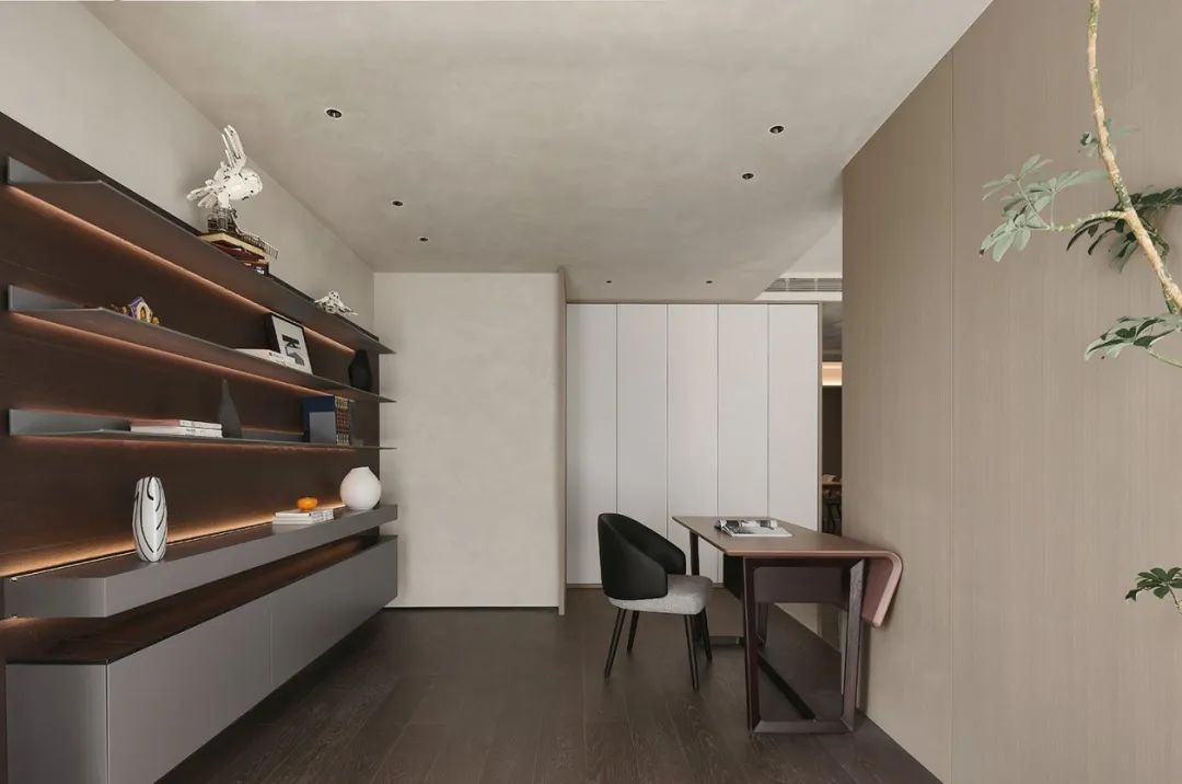 設(shè)計(jì)拆除客廳與臥室之間的非承重墻體,讓兩個(gè)空間的陽臺(tái)串聯(lián),形成了較為開放的書房與環(huán)行動(dòng)線,這種多變可以讓屋主自由地行走在書房與客廳之間。