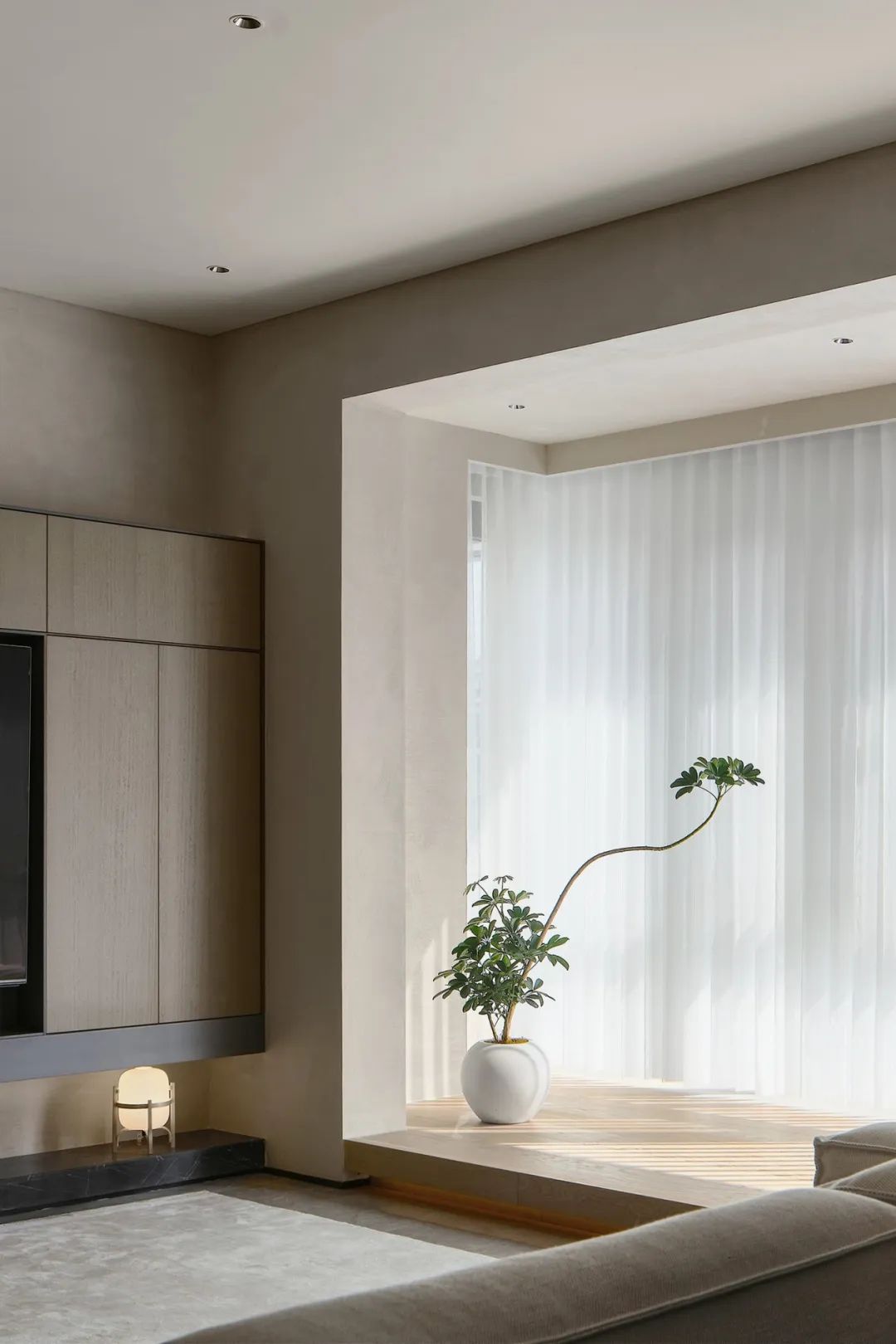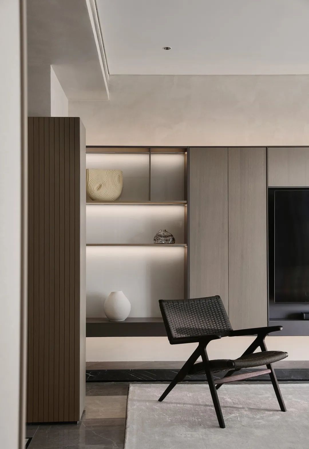 一眼看到的東西很少,而需要感受的東西則很多,金利源懸空呈現(xiàn)的電視柜,我們控制其比例的劃分,色彩協(xié)調(diào),材料的選擇與細(xì)節(jié)處理的方法。展示與收納結(jié)合,材質(zhì)聚集機(jī)理碰撞,然而低飽和度的大地色包容且易融合于居室的氛圍,寂靜不爭,又洞悉一切。