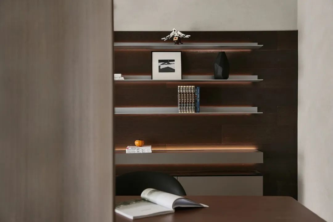 書房中金利源地板材質(zhì)一直延續(xù)到墻面,地板也作為書架的底子,木料的紋理以及嵌入燈光的鋁板在墻面渲染開功能與裝飾。