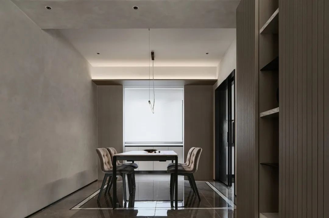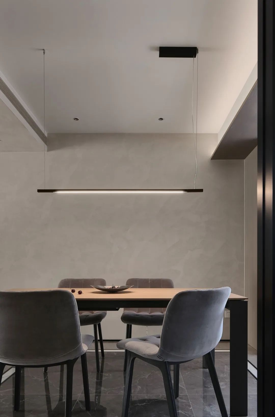 用陽臺(tái)外擴(kuò)的空間補(bǔ)充功能,安排出合適的操作和西廚電器收納區(qū)域。門洞之上利用光線向上延伸進(jìn)行視覺方向引導(dǎo),光經(jīng)頂面反射到桌面,四壁的微水泥霧氣般的質(zhì)樸肌理在現(xiàn)代空間中變得清透起來。