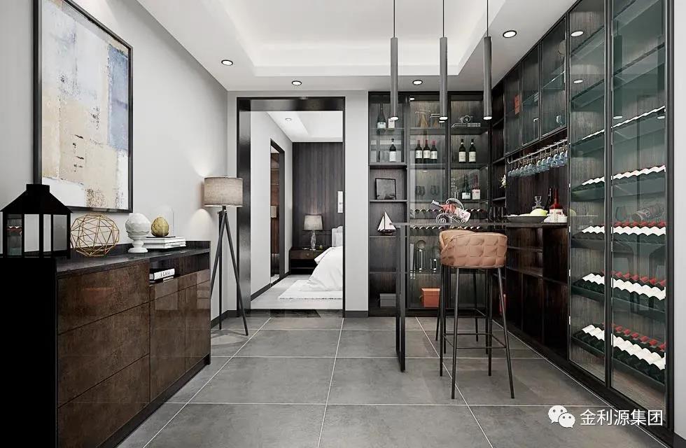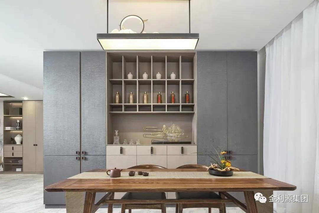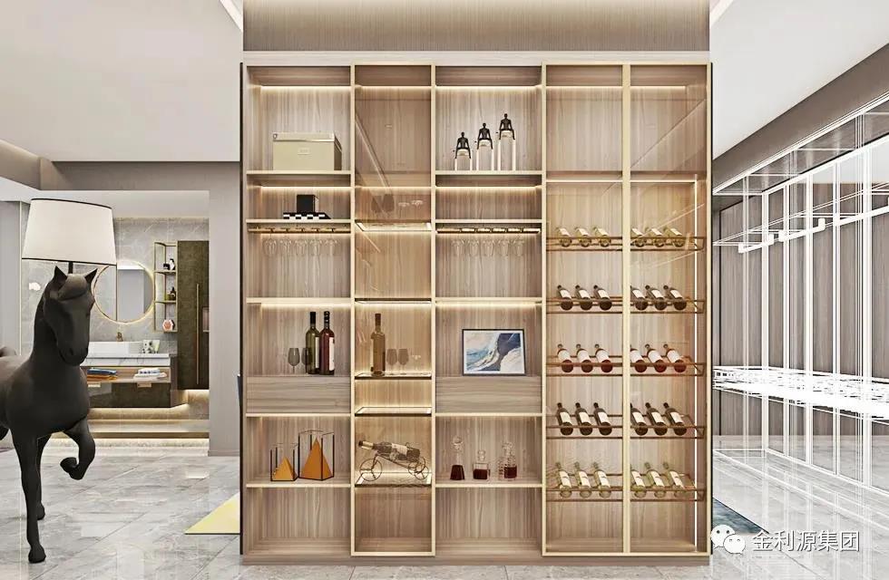 新中式風(fēng)家居如何協(xié)調(diào)不同種類酒的藏與露?采用半開放架+封閉式結(jié)合,外露的開放架仿窗格設(shè)計,將高低尺寸差異化,返璞歸真,更添古韻。