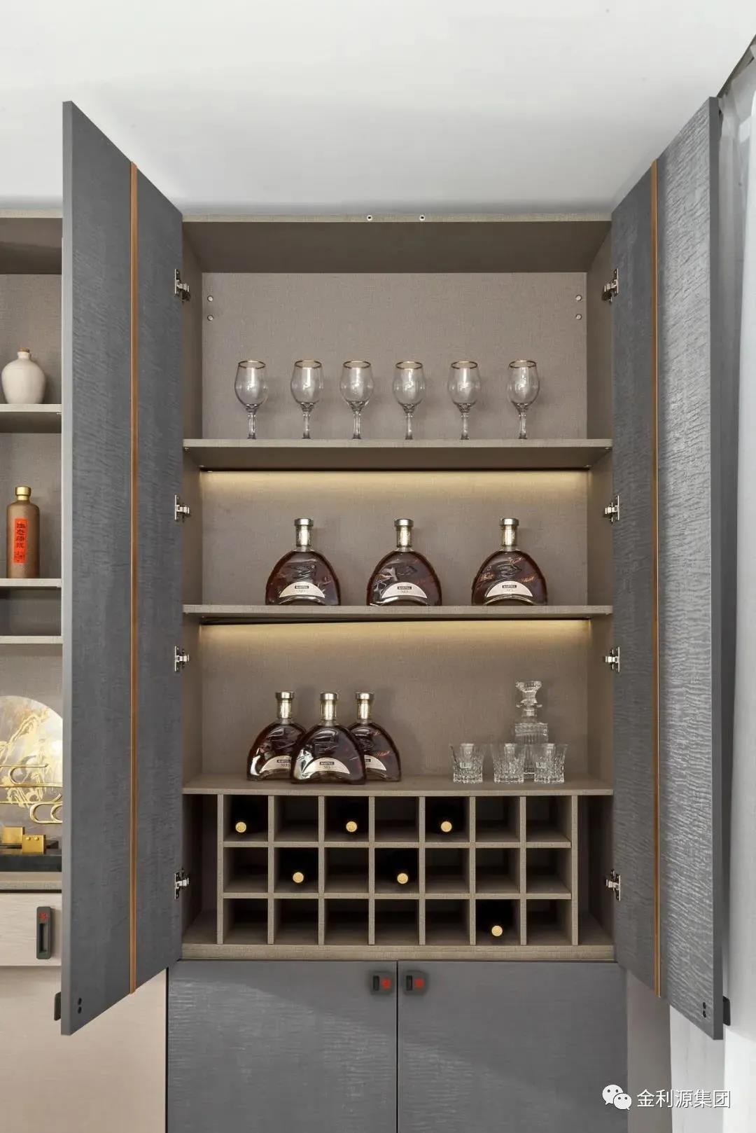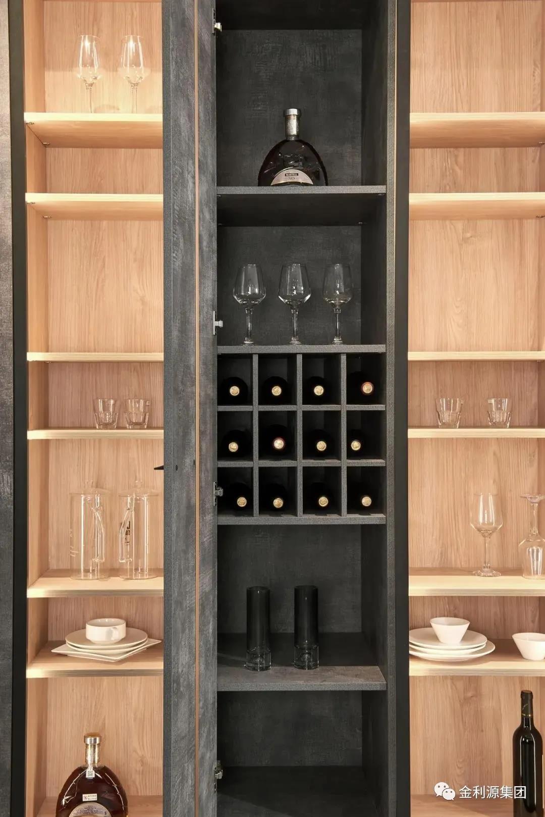 開門柜內(nèi)置紅酒架,不同高度的三層層板+紅酒收納格,滿足各種酒類的收納需求,生活品味在此沉淀。