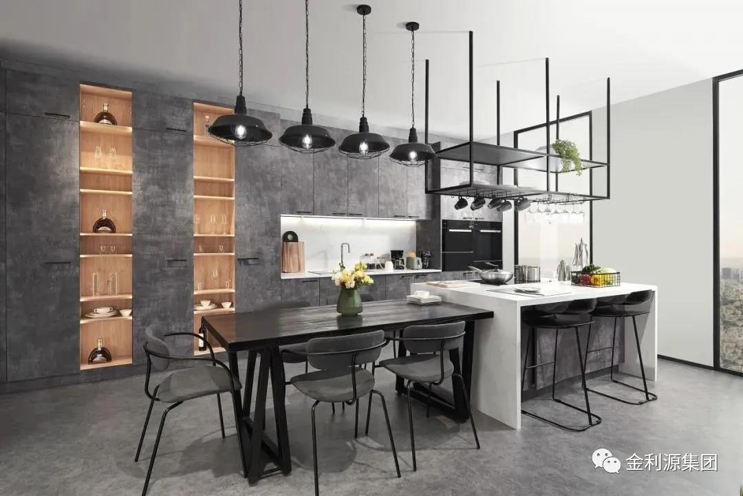 工業(yè)風(fēng)廚餐廳的開放式酒架設(shè)計,兩排直立的平酒架簡約別致,用材質(zhì)的碰撞體現(xiàn)硬朗與柔和,實(shí)用功能的基礎(chǔ)上更添設(shè)計感。結(jié)合向內(nèi)照射的嵌入式光源,見光不見燈,照明更柔和。