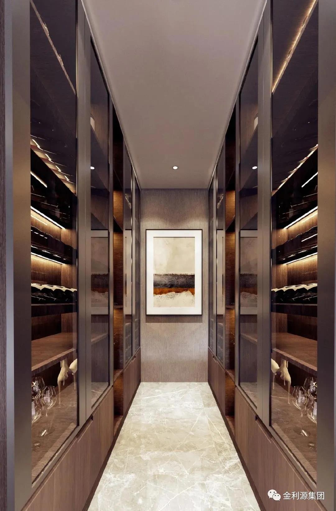 雙一字酒柜布局,打造如酒窖般的儲酒環(huán)境,滿足不同酒類的儲存。玻璃柜門增加空間通透感,集收藏與展示一體,盡顯主人家居品味。
