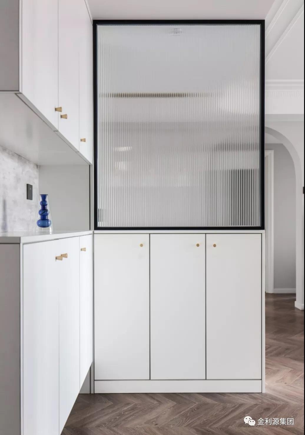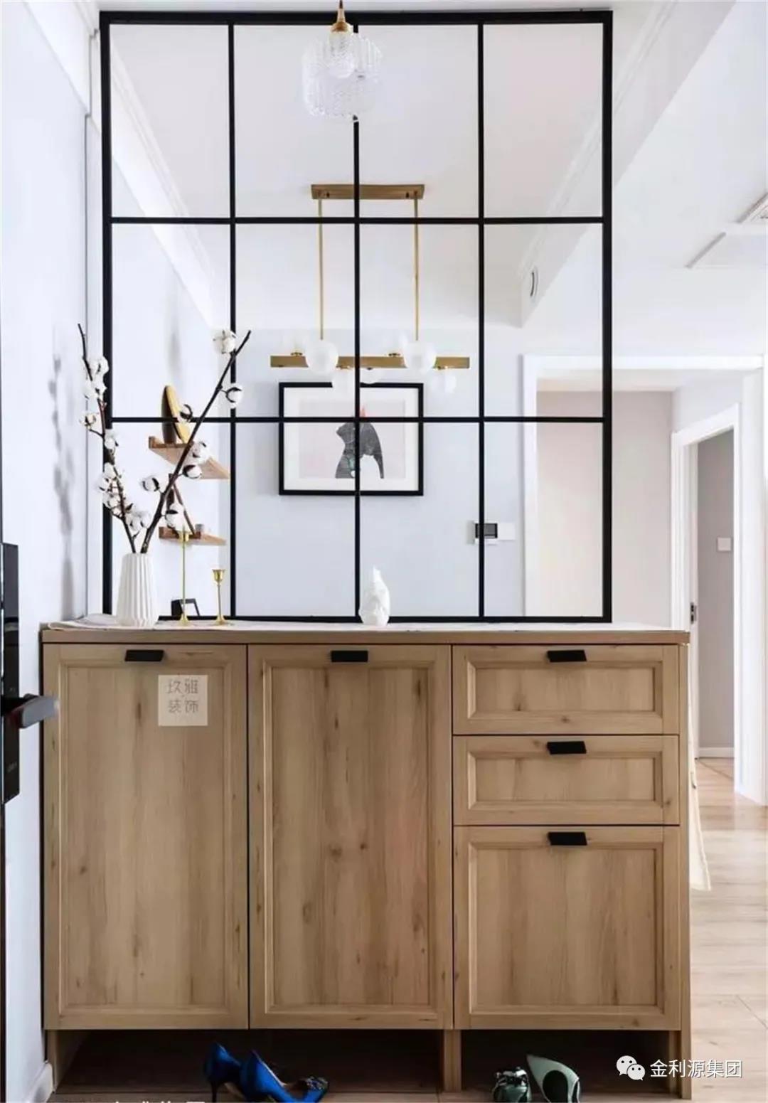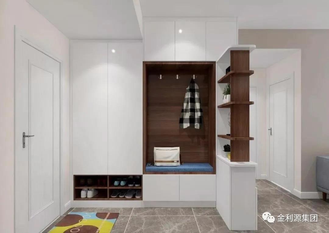隔斷柜想要兼顧美觀和收納,設計為下層封閉收納,上層留空或用玻璃隔斷;高低柜組合搭配,儲物空間富余,保證入戶光線的充足。