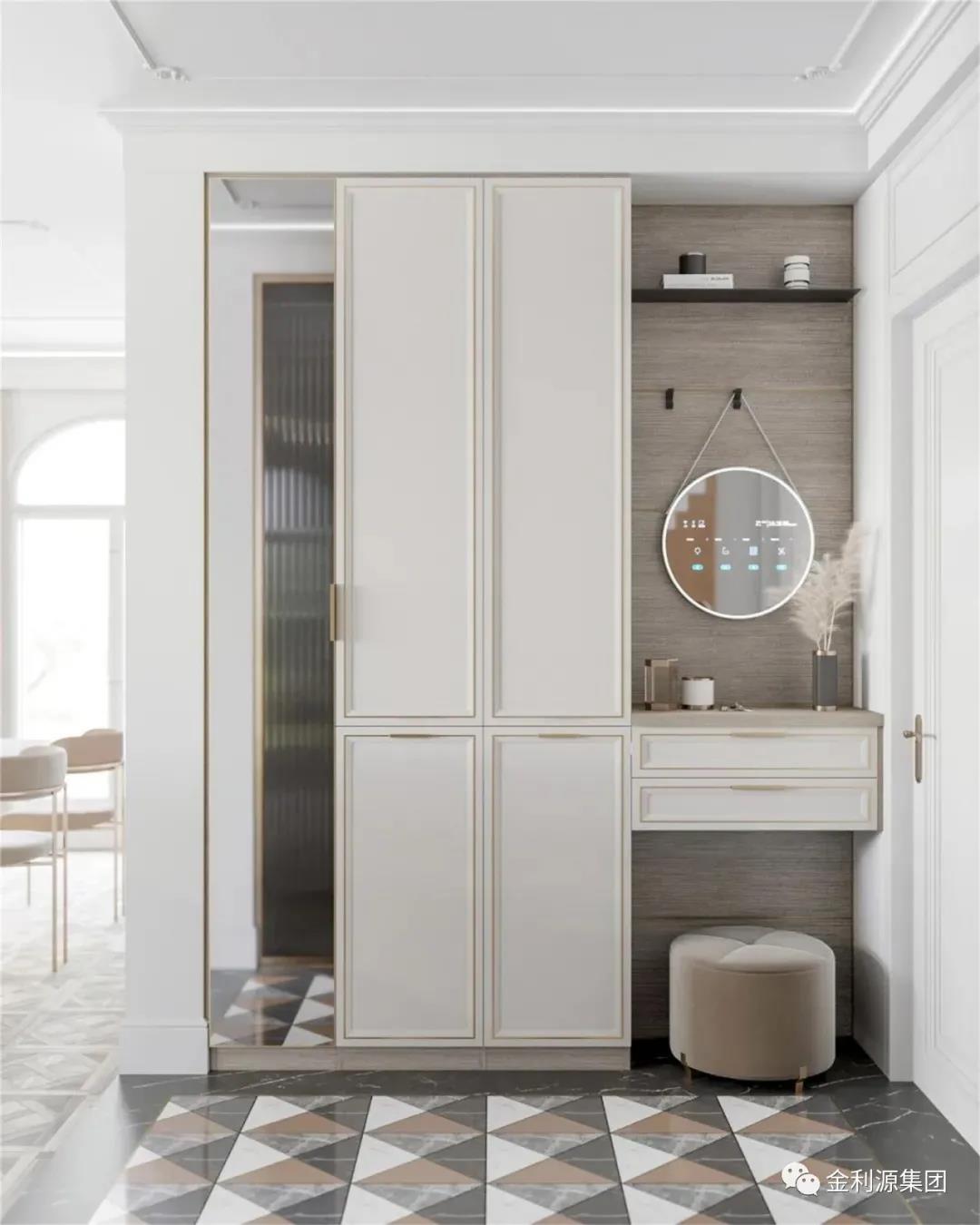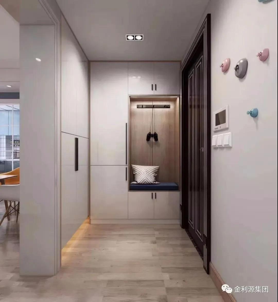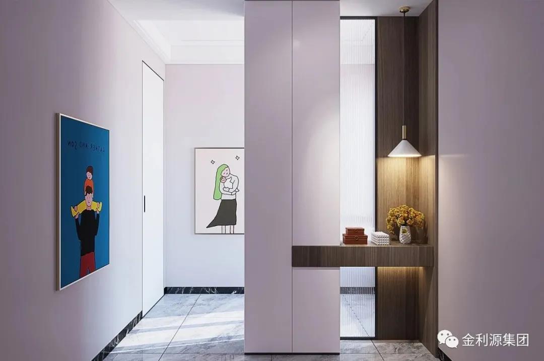 隔斷柜想要兼顧美觀和收納,設計為下層封閉收納,上層留空或用玻璃隔斷;高低柜組合搭配,儲物空間富余,保證入戶光線的充足。
