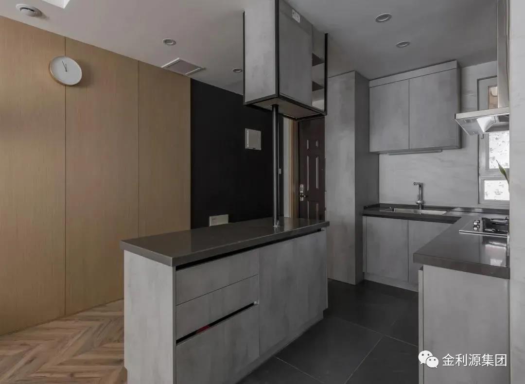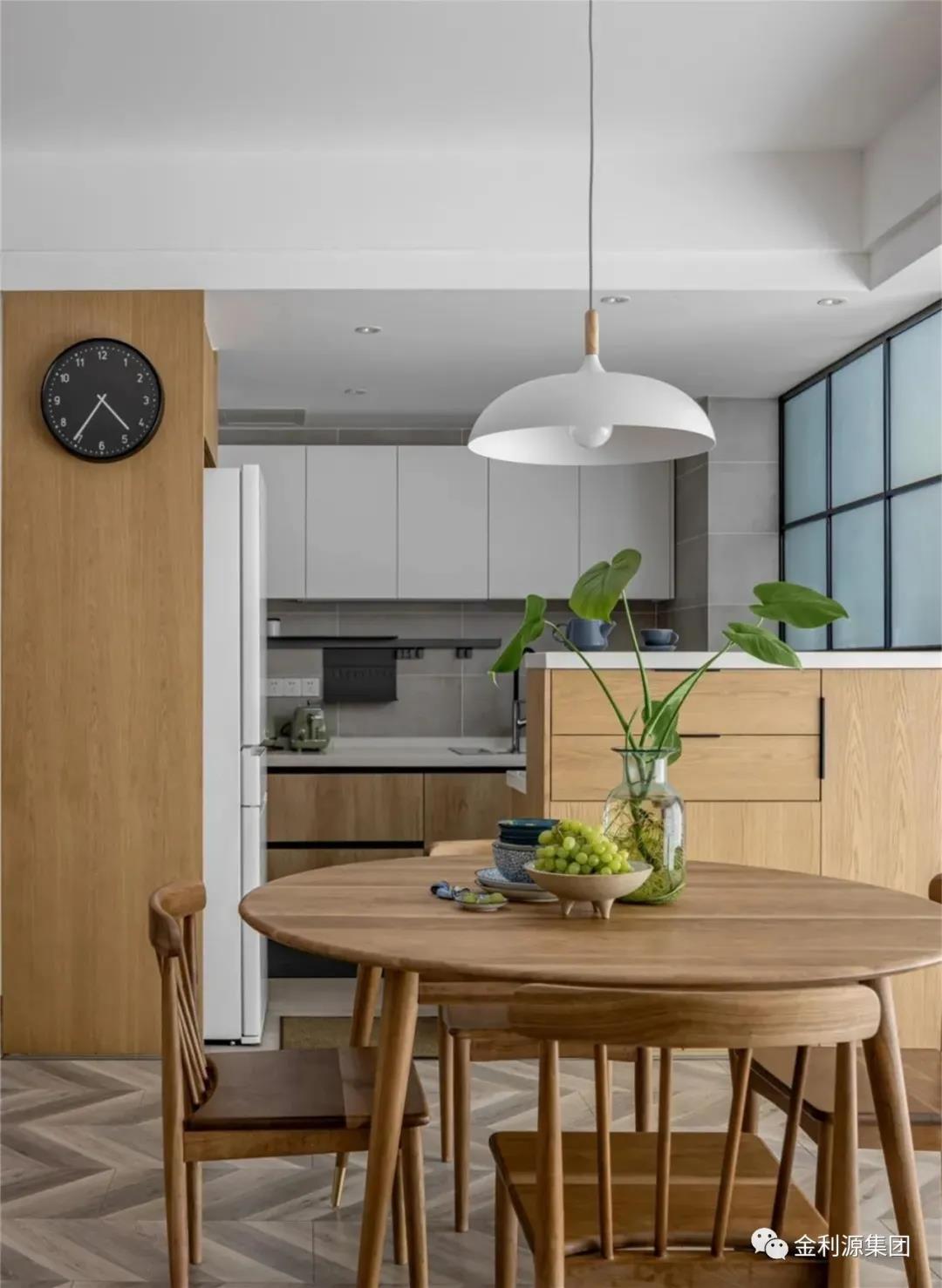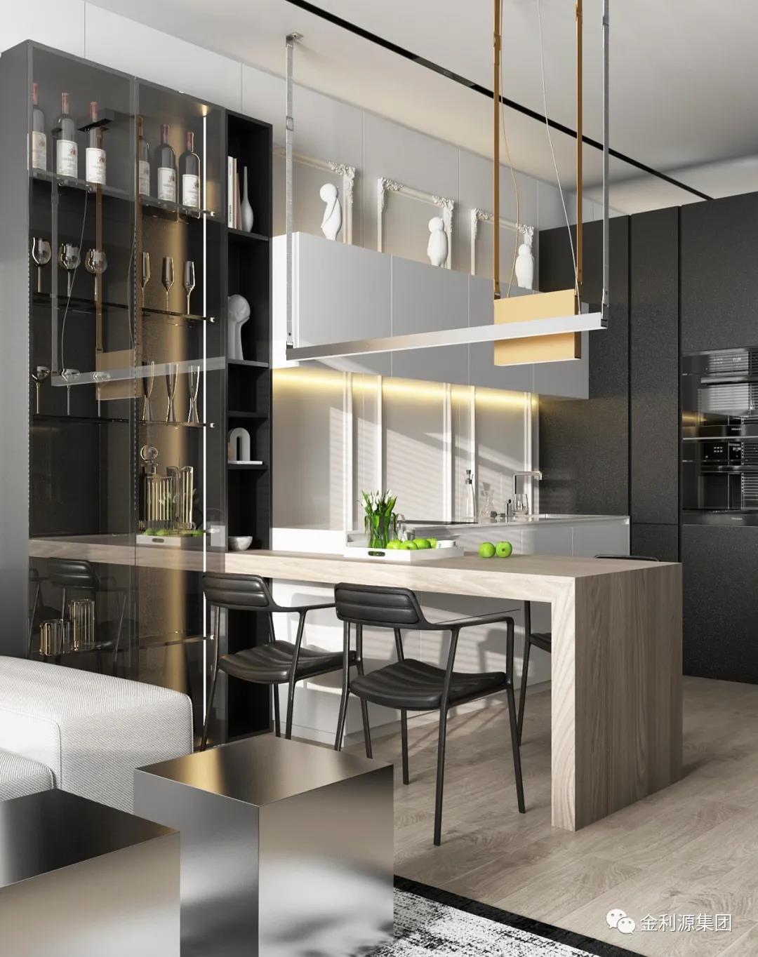 開放式的廚房想要與餐廳保持隔而不斷,吧臺柜是最好的選擇,不僅起到隔斷和儲物的作用,還能夠成為備餐區(qū)域,彌補廚房臺面空間的不足,優(yōu)化生活動線。