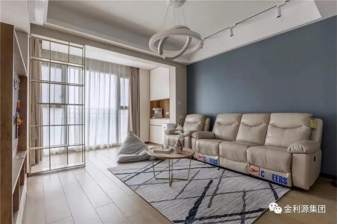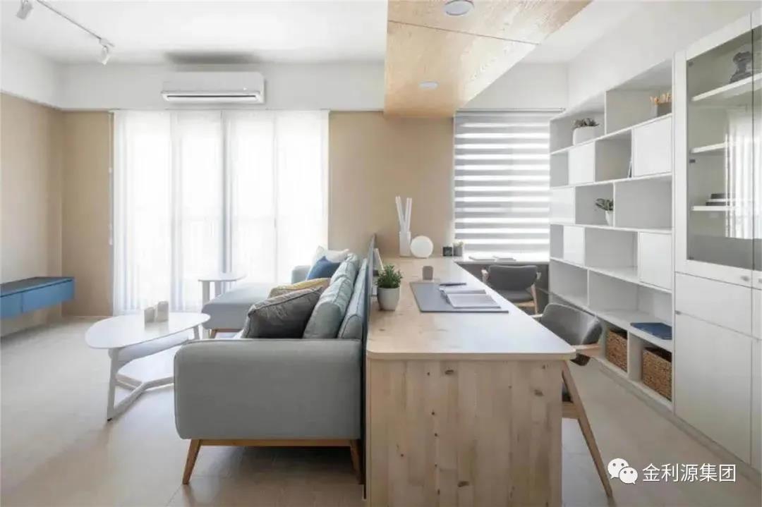 大橫廳的戶型,可以讓沙發(fā)居中擺放,后方定制一款矮柜作為隔斷,保證空間的開闊度和采光,達到一室兩用,同時多了一個隱藏物品的好去處。