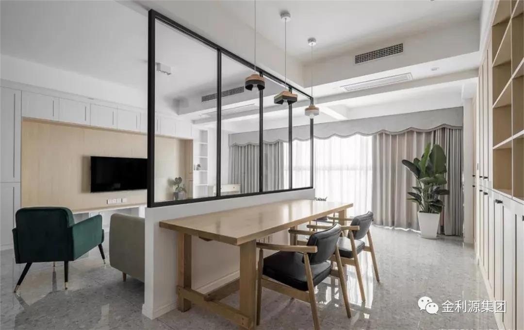開放式客餐廳,格局大開,采光一流,從視覺上拉大整體空間,看起來敞亮通透。雖然很好,但是又希望兩個區(qū)域有所獨立,那不如做個隔斷柜吧。
