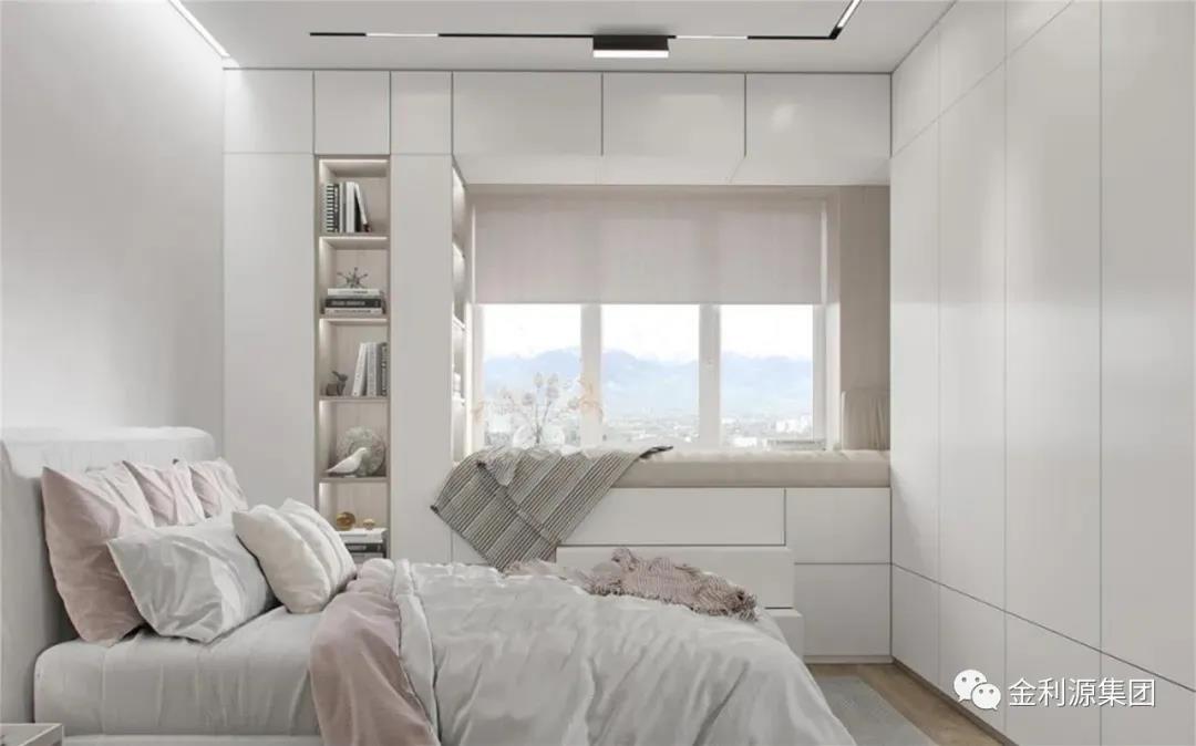 ▼ 利用窗臺(tái)的特點(diǎn),設(shè)計(jì)出別具一格的飄窗柜。窗臺(tái)處卡座+衣柜的組合設(shè)計(jì),不僅增添了臥室的休閑之地,更加增添了臥室的儲(chǔ)物功能。