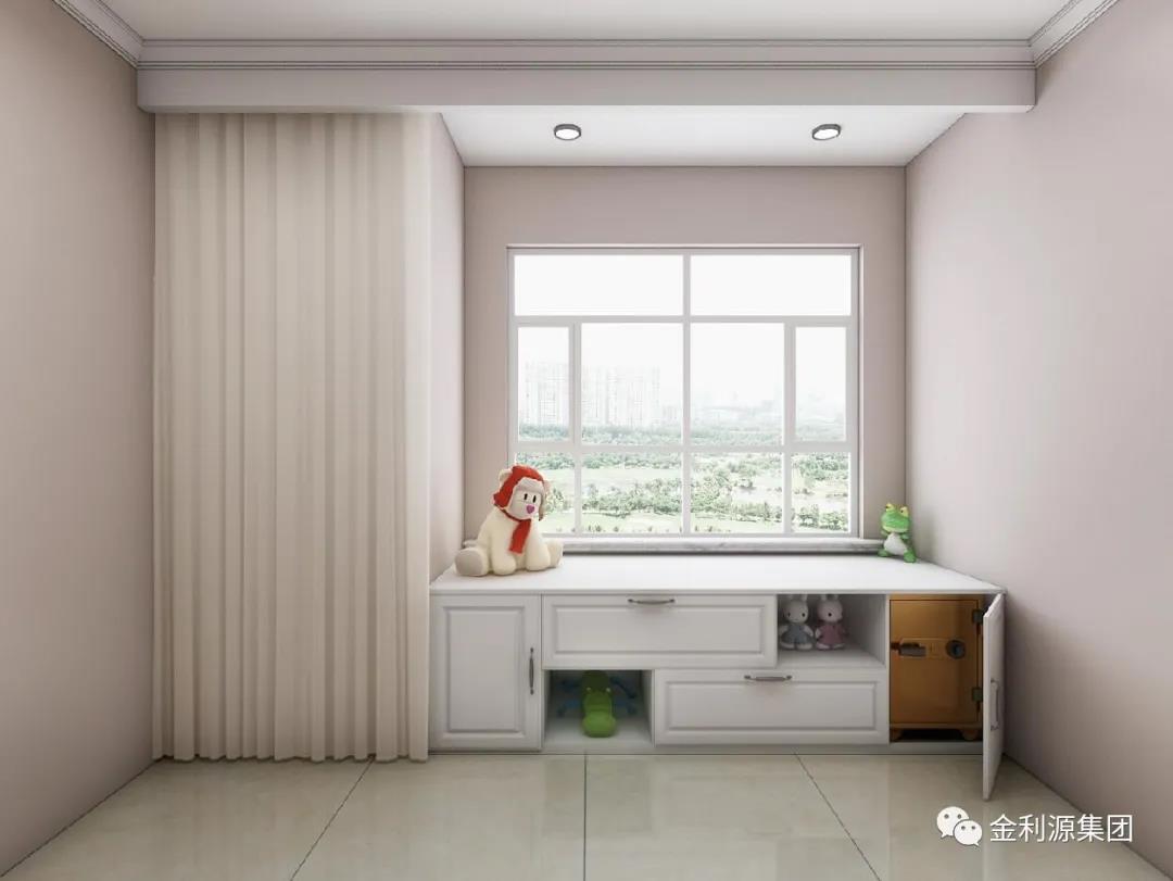 把飄窗打造成一個(gè)收納間,在底部和兩邊墻上打上柜子,可以用來存放書籍、玩具,也可以用來擺放裝飾品,裝點(diǎn)室內(nèi)。