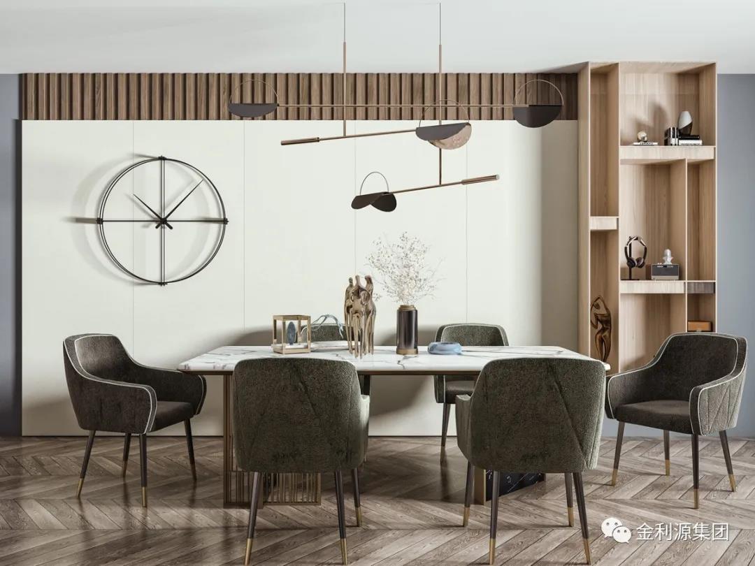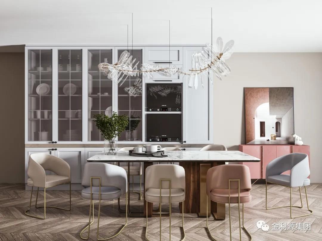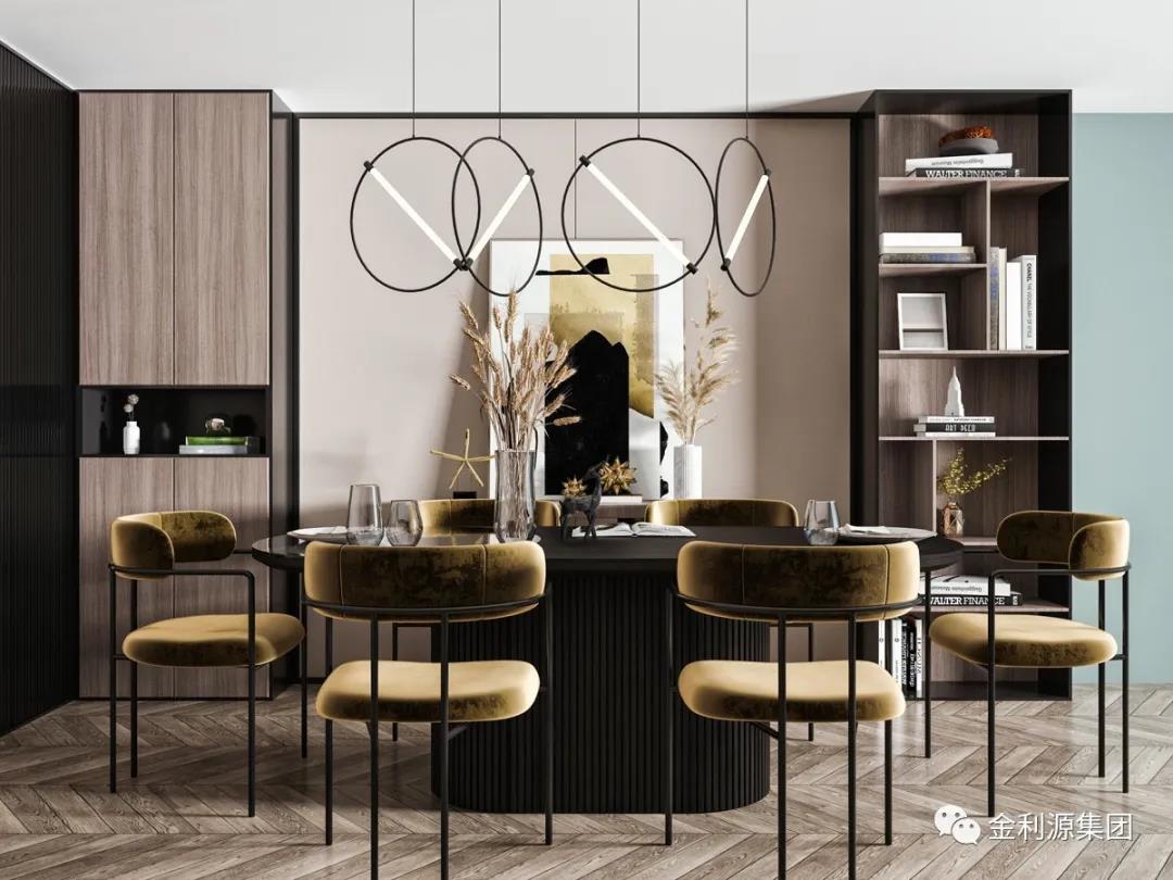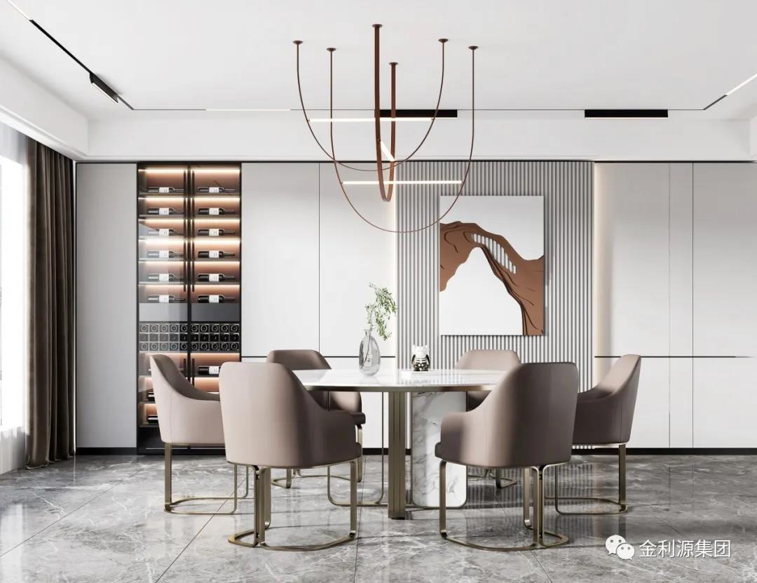 除了玻璃柜門,可以在原有餐邊柜基礎上增加開放金屬裝飾架,搭配極富層次感的描金線條,真正實現(xiàn)個性化展示。
