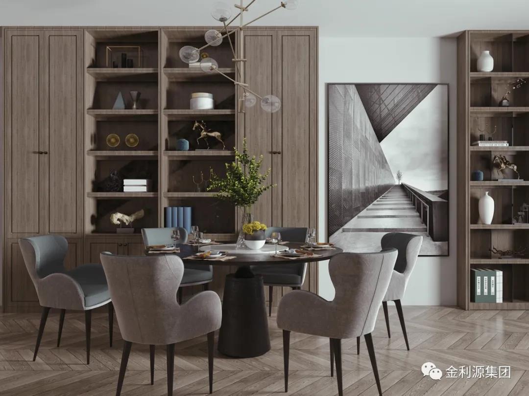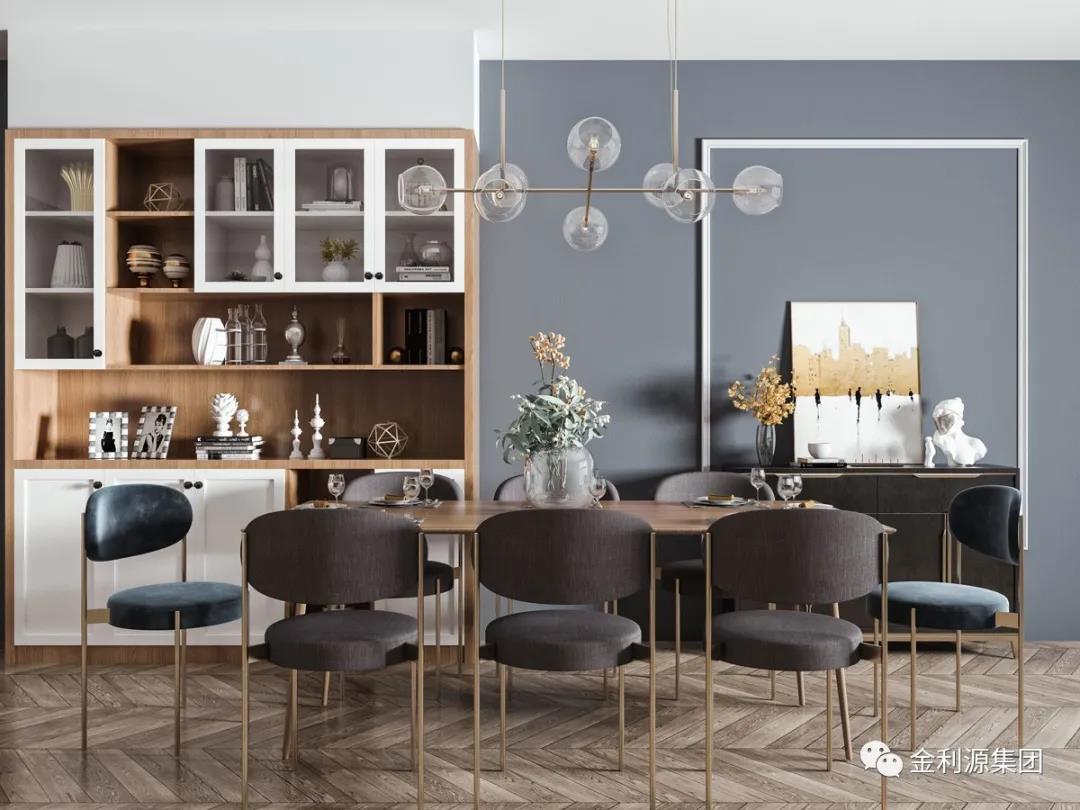 對于愛收藏漂亮餐具的小伙伴,展示區(qū)+餐邊柜是最完美的組合。餐廳區(qū)域的餐邊柜局部鏤空的套色布局,一是為了好看,富有設計感,二是作為展示作用。