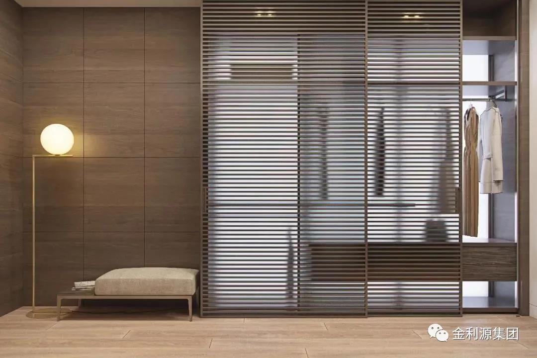 透明衣櫥的門也可以加入木格柵的設(shè)計(jì),板條之間隱隱約約的透明性,令視覺效果更豐富。