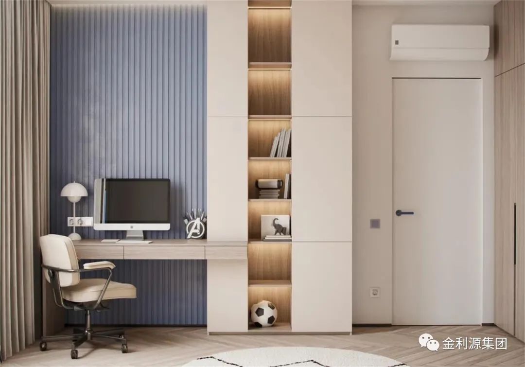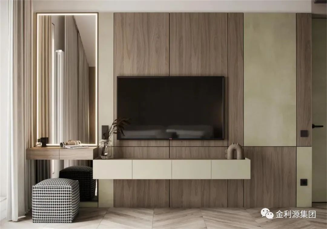 懸空的桌板或者薄柜可以當(dāng)做書桌或梳妝臺使用,沒有桌腿的設(shè)計減輕了對地面的壓迫,視覺上更加輕盈靈活,也更具高級感。
