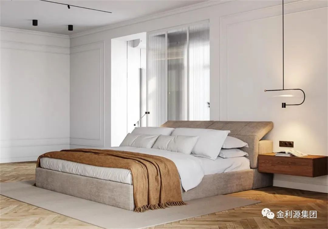 輕盈的懸浮式床頭柜,避免了傳統(tǒng)造型的呆板與笨重感,將柜體變成簡約輕盈。