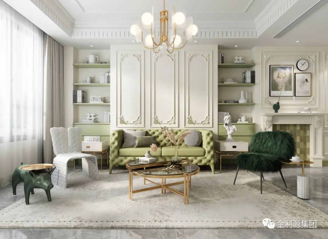 法式墻面一般會有墻板和線條,另外還有裸磚墻、乳膠漆的裝修方式。給人一種舒適,充滿生機的溫馨氣氛今年用彩色乳膠較常見。