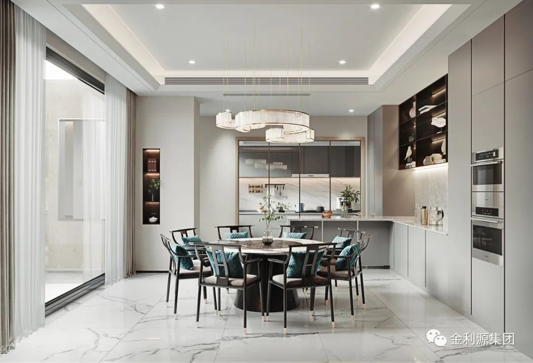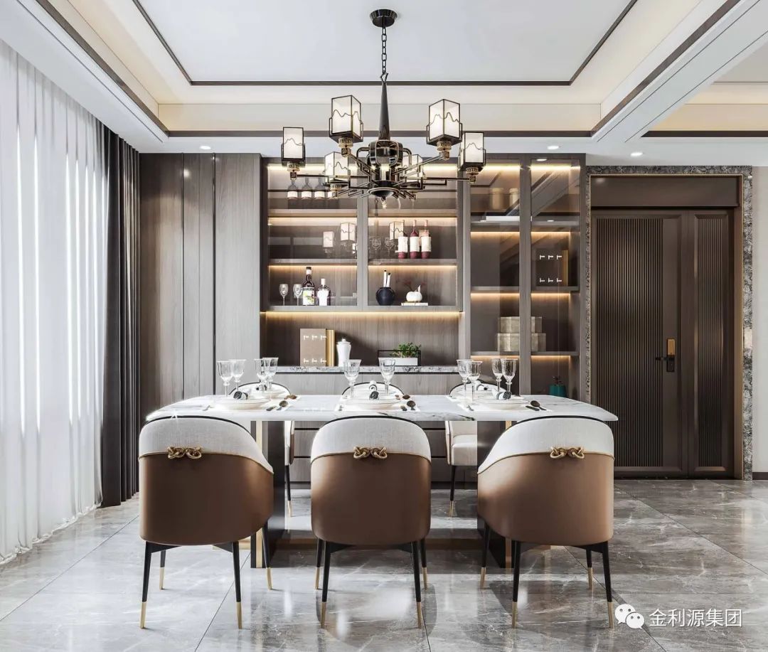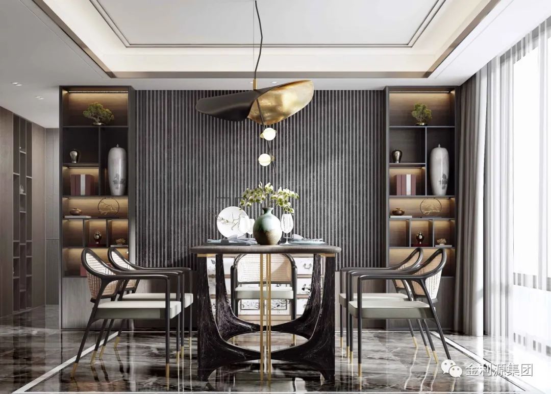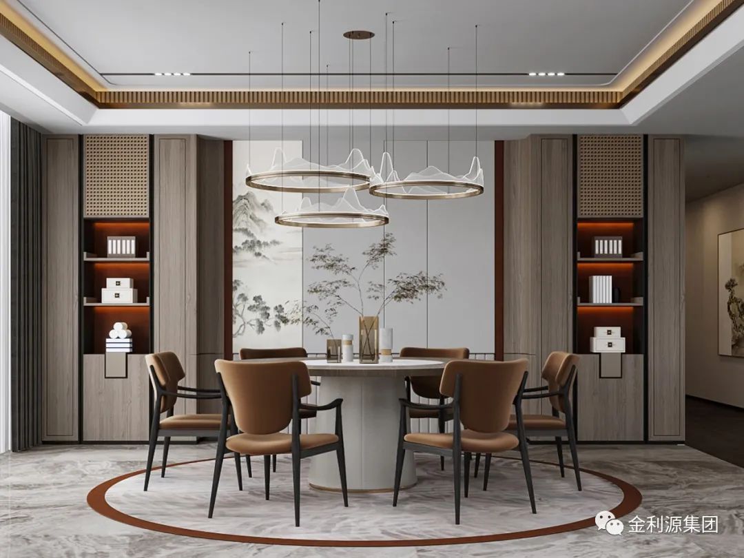 在與現(xiàn)代風(fēng)格的設(shè)計(jì)元素結(jié)合后,新中式的餐桌椅搭配中,開(kāi)始加入了軟質(zhì)的餐椅坐墊或靠背,這種舒適愜意的家具,搭配出來(lái)的新中式顯得更加的簡(jiǎn)約雅致。