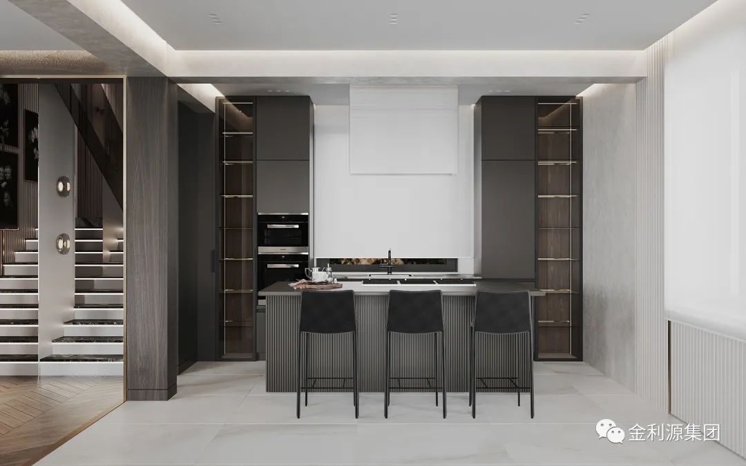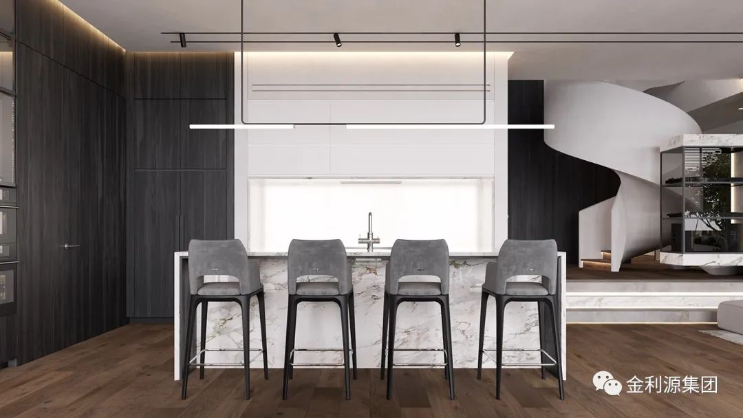 還有一種是將餐廚區(qū)分為內(nèi)廚和外廚,比如在復(fù)式或者別墅里就比較適合,油煙大的就在內(nèi)廚操作,簡單的烹飪就在外面操作,一般就準備個電磁爐、水槽和切菜板就可以滿足,樓梯下方的空間,可以設(shè)計為輕食區(qū)的臺面,與餐桌連在一起使用。