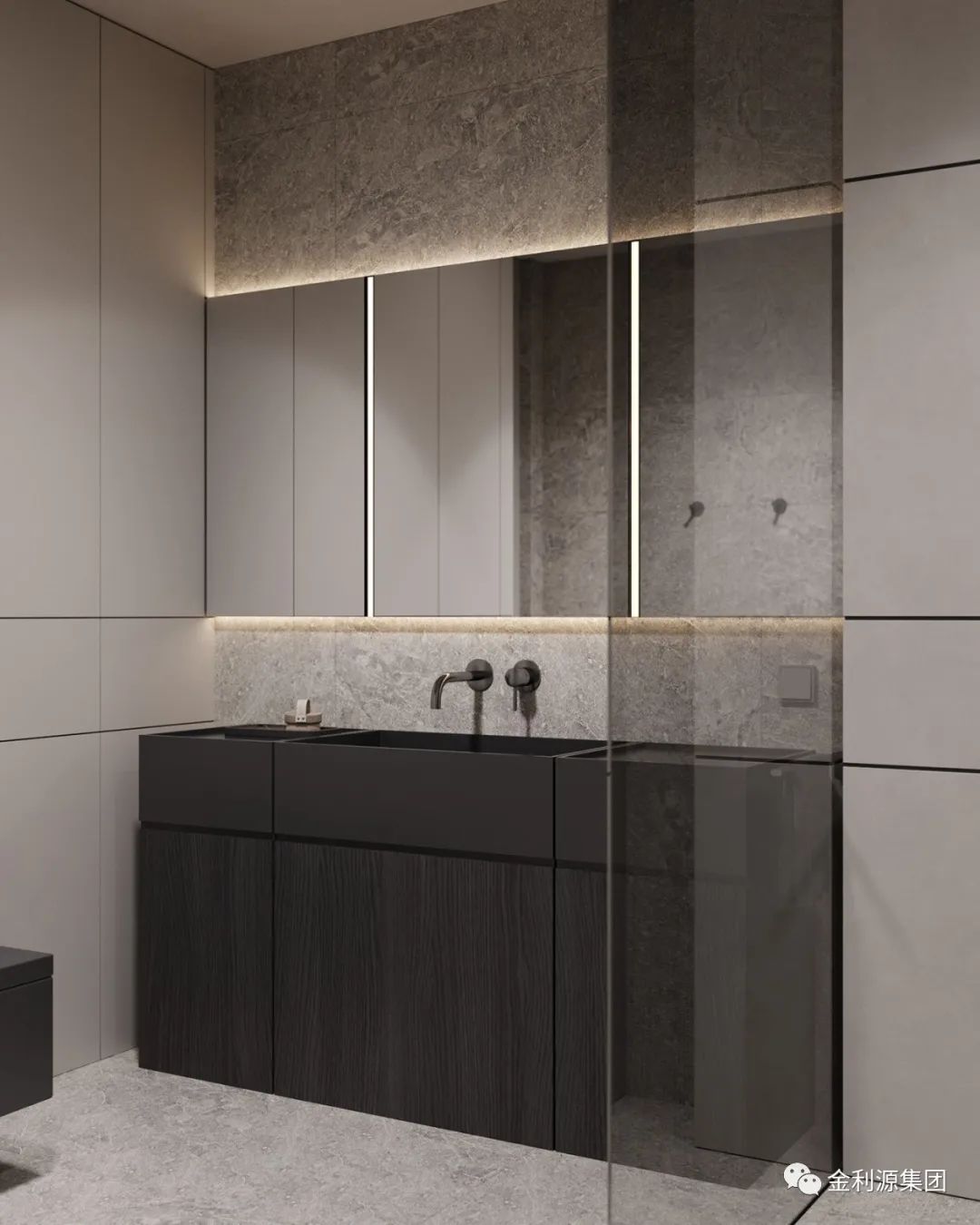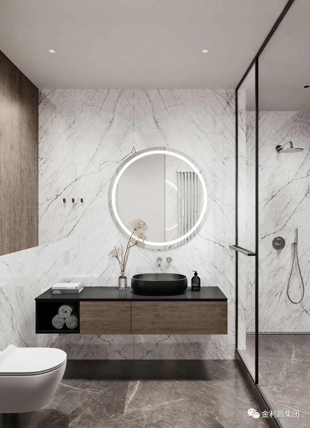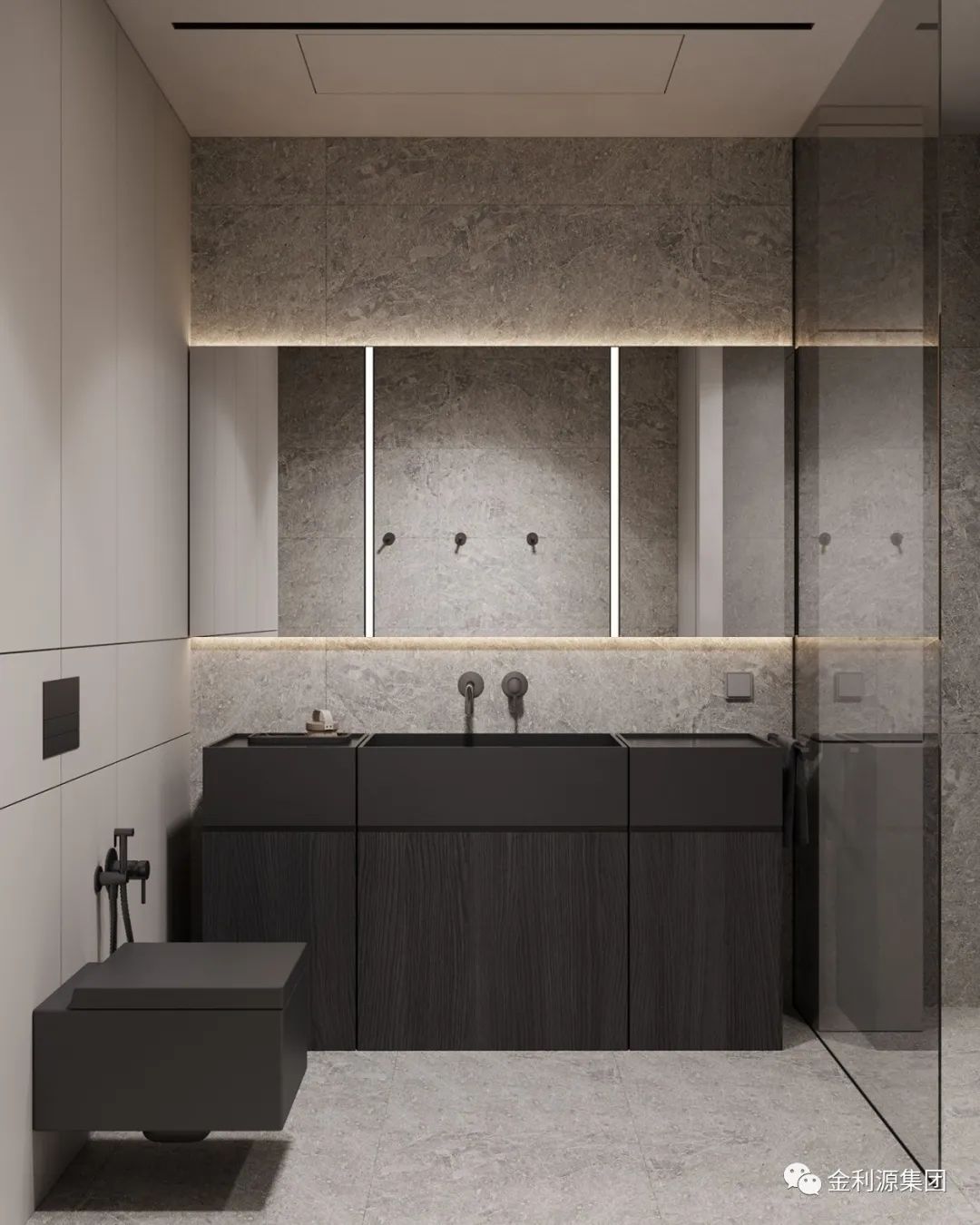相較于浮式洗漱臺,壁掛式洗漱臺多了一層平面以及壁掛柜臺,不僅有浮式的設(shè)計美感,又有強大的收納性。是一個選擇性極高設(shè)計。