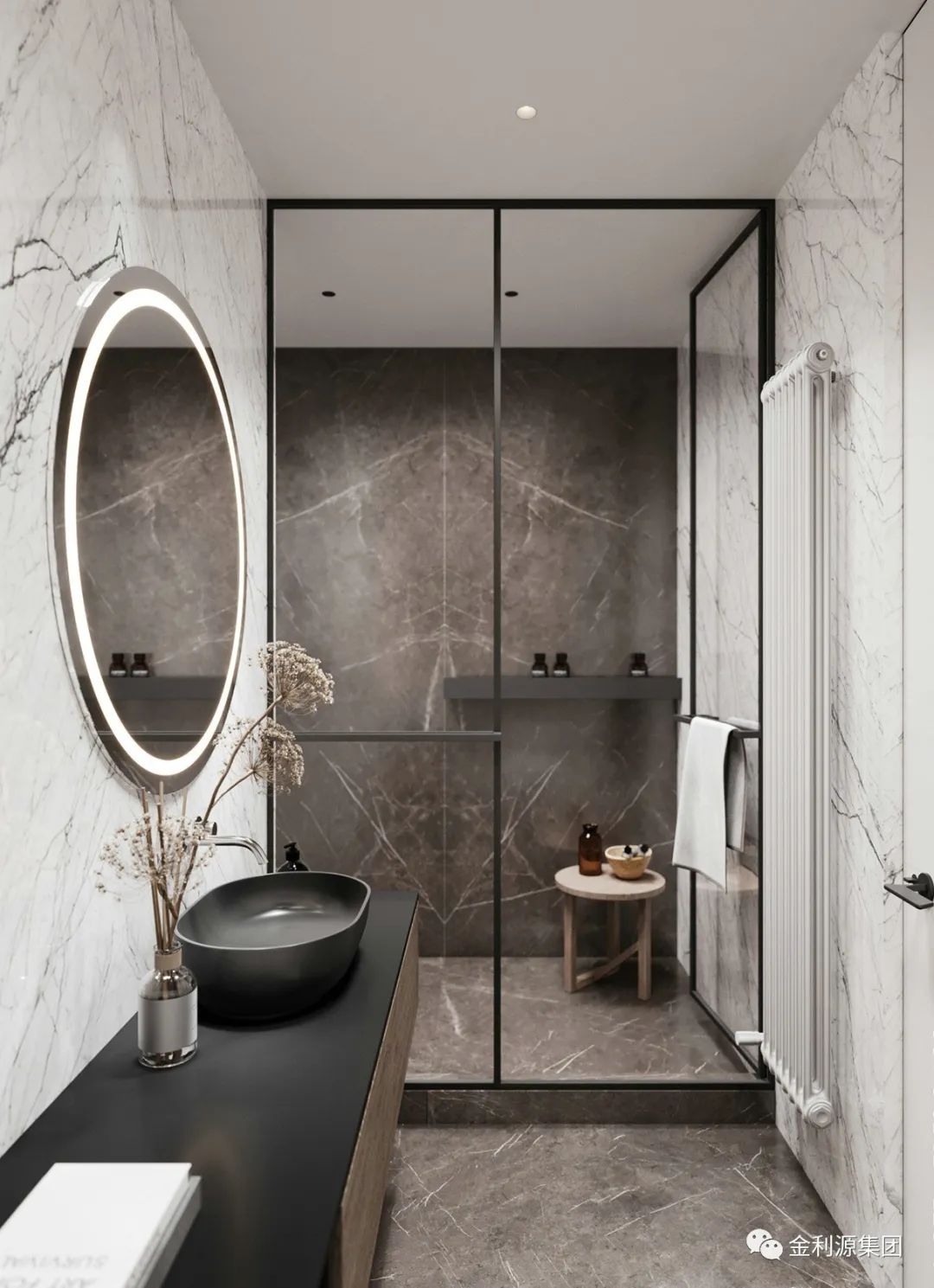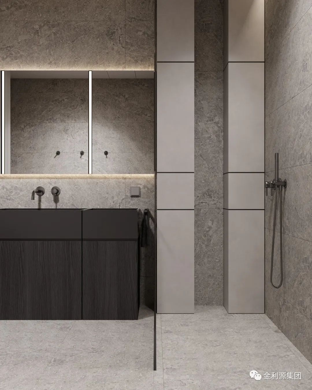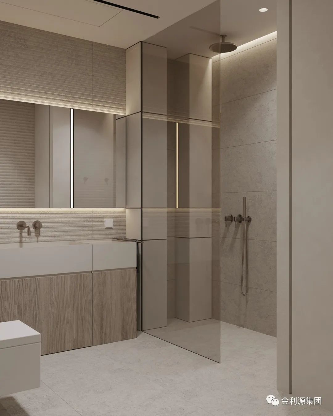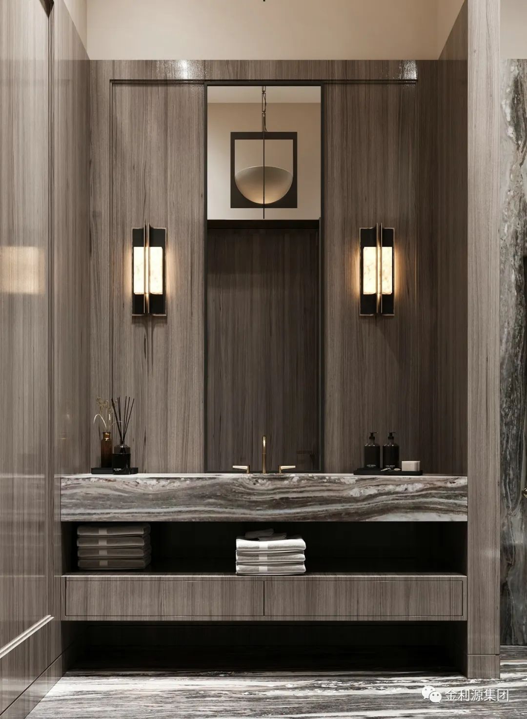 相較于浮式洗漱臺,壁掛式洗漱臺多了一層平面以及壁掛柜臺,不僅有浮式的設(shè)計美感,又有強大的收納性。是一個選擇性極高設(shè)計。