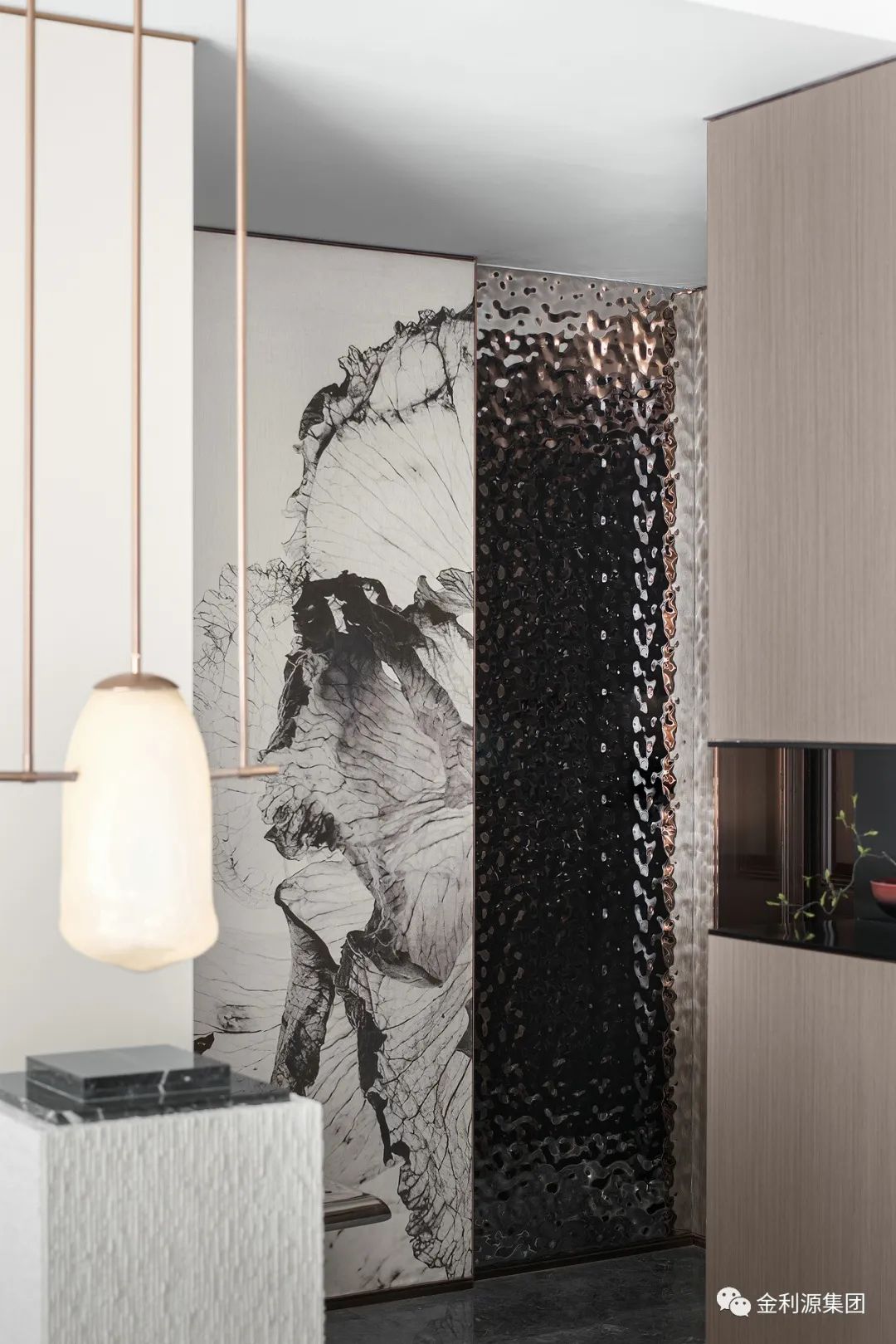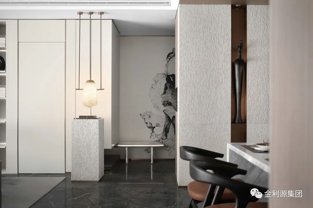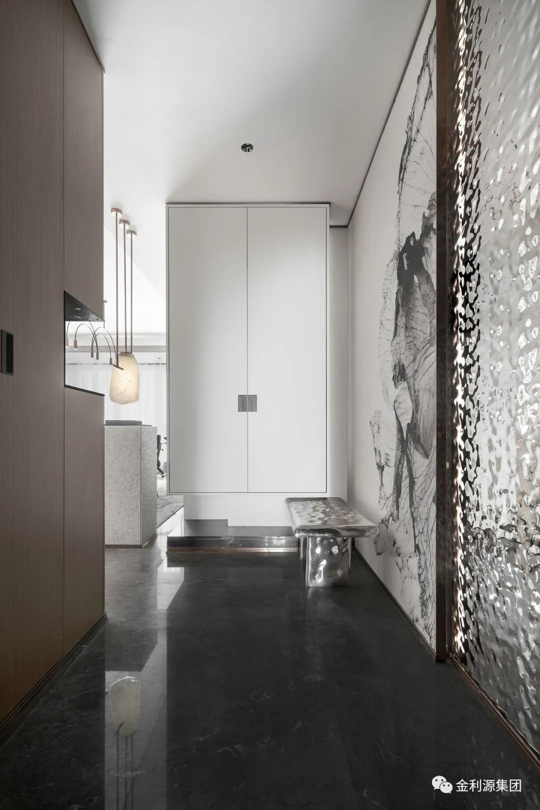 玄關(guān)不一定要占很大走廊空間,但一定要在入門配色上確定好房間主色調(diào)。墻面綻放的潑墨畫以水波紋的姿態(tài)衍生出文化意蘊(yùn),強(qiáng)調(diào)黑白配色的常規(guī)感。