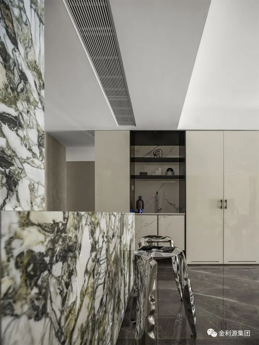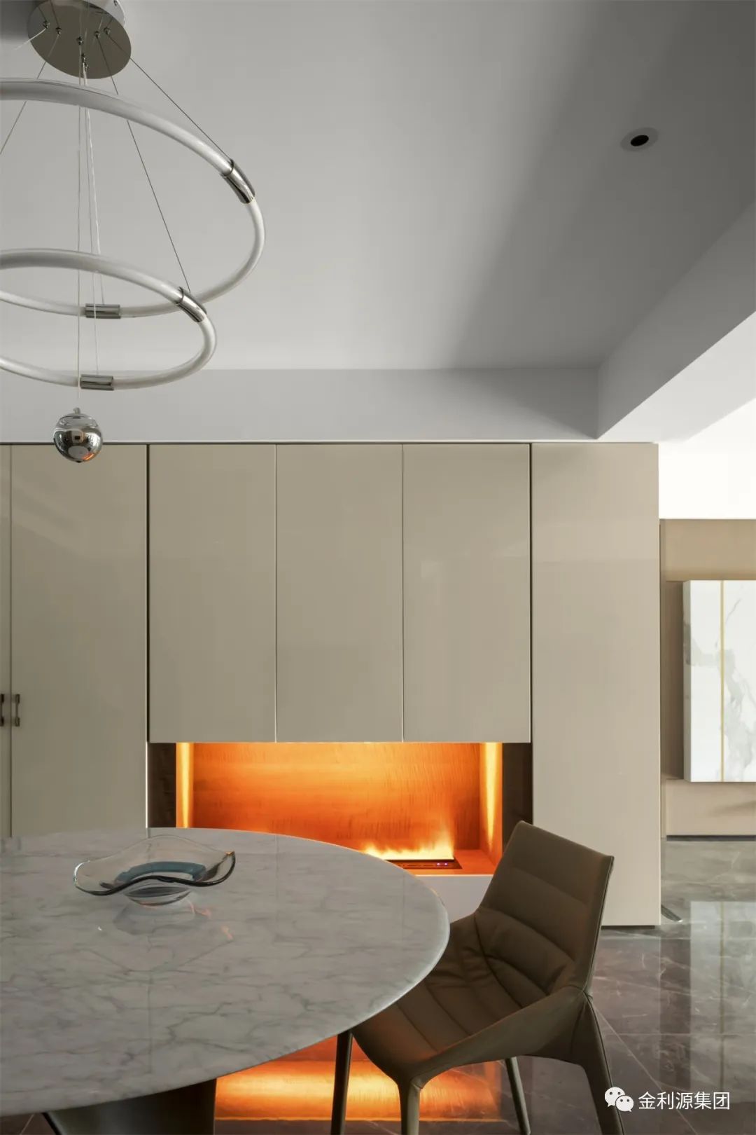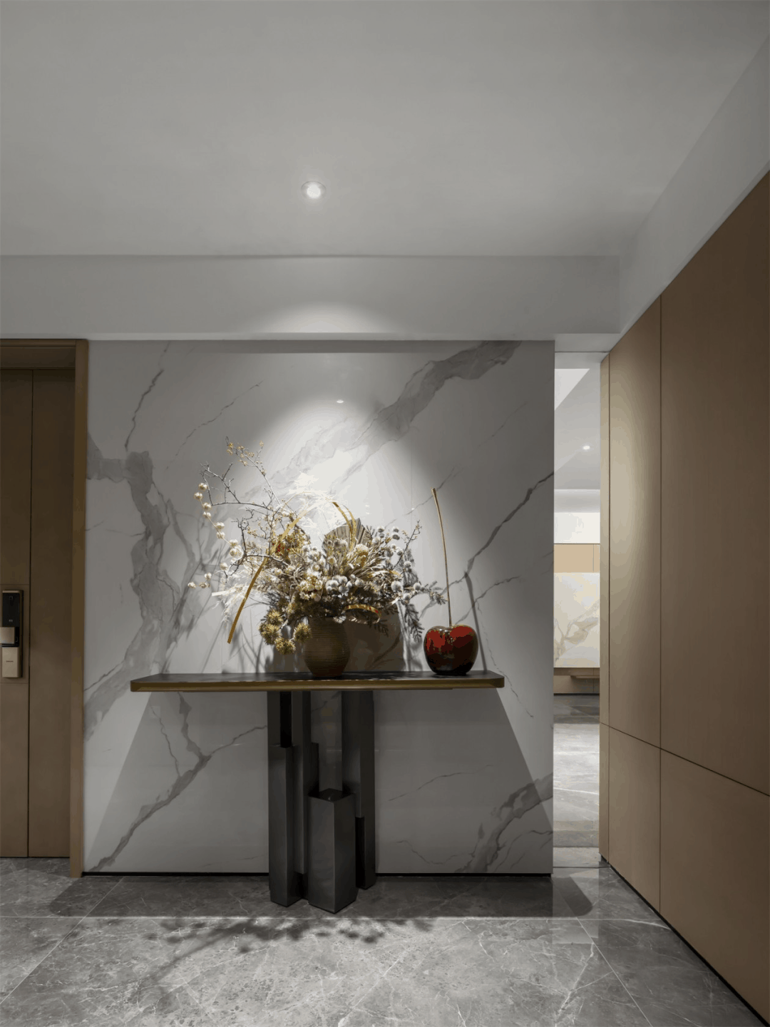 右邊是玄關(guān)的的大理石背景板,左邊是溫潤(rùn)的木飾面,兩種材質(zhì)的碰撞,有一種安靜儒雅之感。紅色的擺件和過道的色調(diào)形成鮮明的對(duì)比,視覺沖擊力更強(qiáng)。
