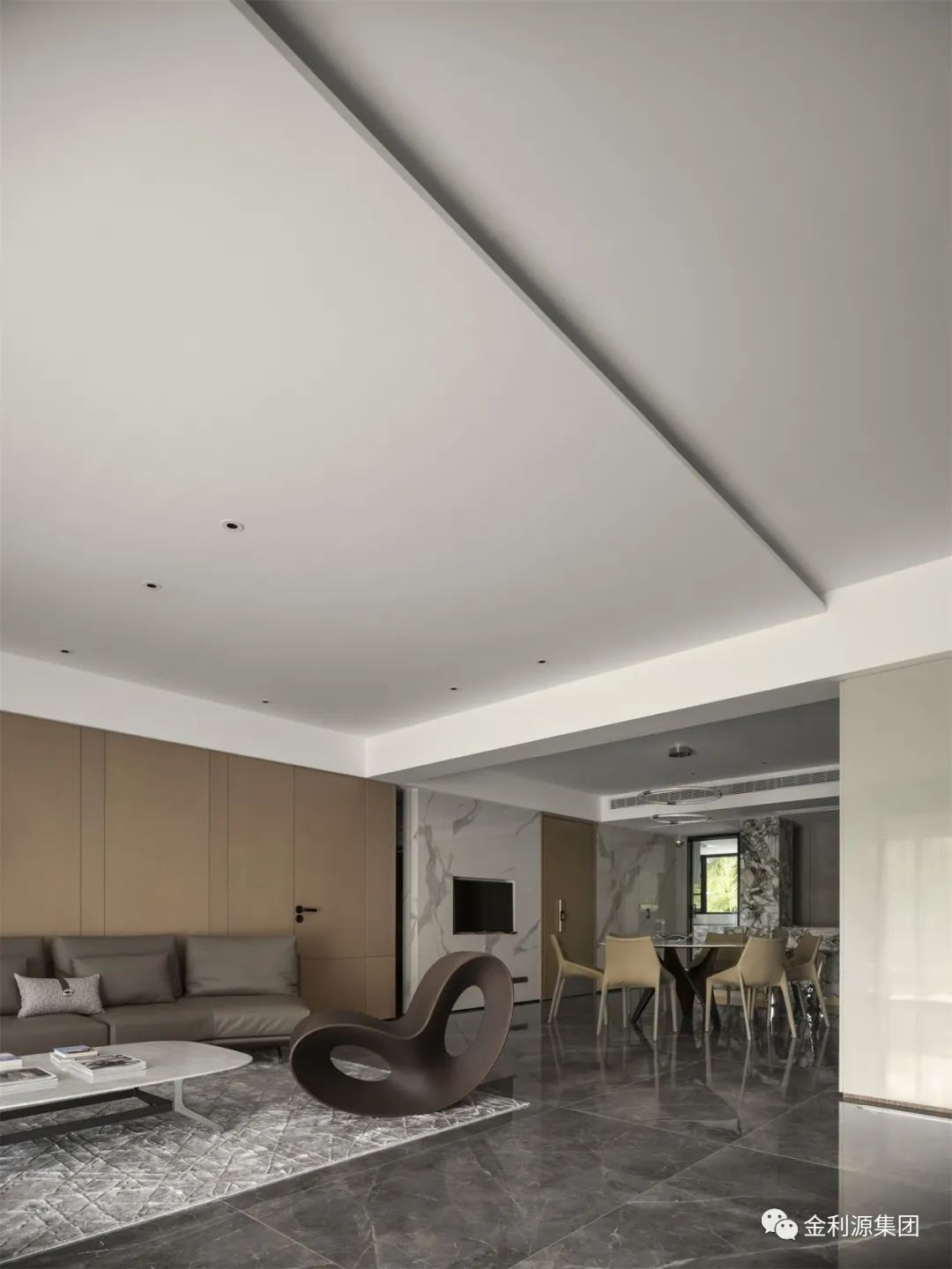 客廳采用無主燈設(shè)計(jì),巧然清簡(jiǎn),結(jié)合射燈進(jìn)行輔助照明滿足多種場(chǎng)景所需;