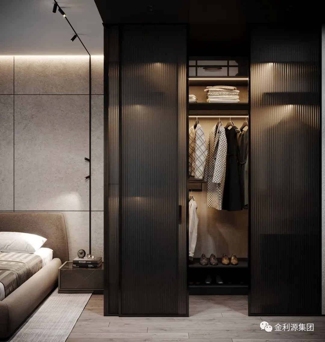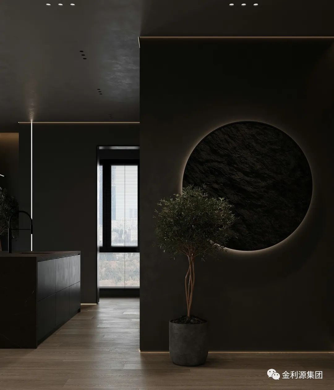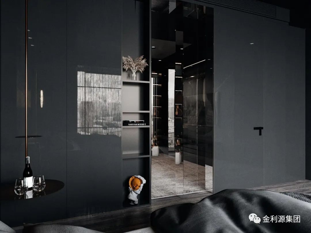 配以灰色系的墻布,質(zhì)感上偏向于磨砂,營造出一種相當(dāng)通暢的視覺氛圍,另外,在黑的熏染下,使空間不過于壓抑厚重,反而充滿靈性。