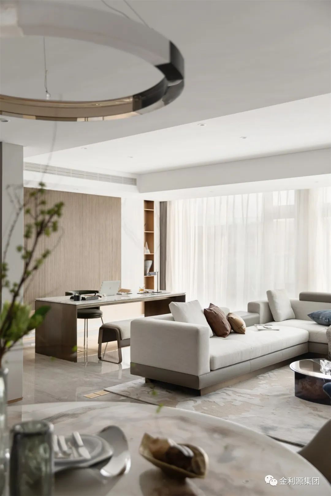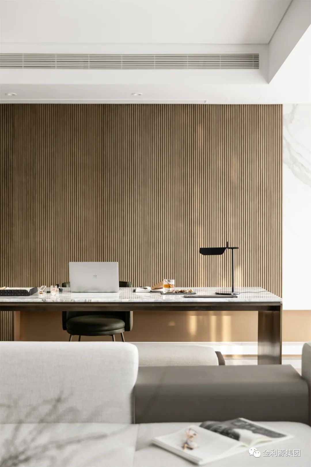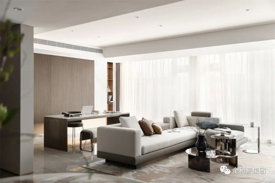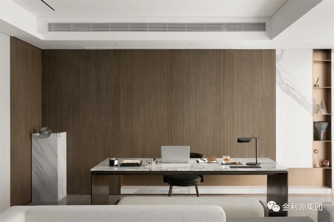 書房處的設(shè)計(jì)與客廳一脈相承。工作、生活與家庭氛圍在清透開闊的書房空間中流淌,而現(xiàn)代簡(jiǎn)潔的設(shè)計(jì)美感、光影渲染下的空間韻律、靜怡雅致的現(xiàn)代軟裝都被巧妙融入在了這疊墅秘境里。生態(tài)板品牌—金利源板材