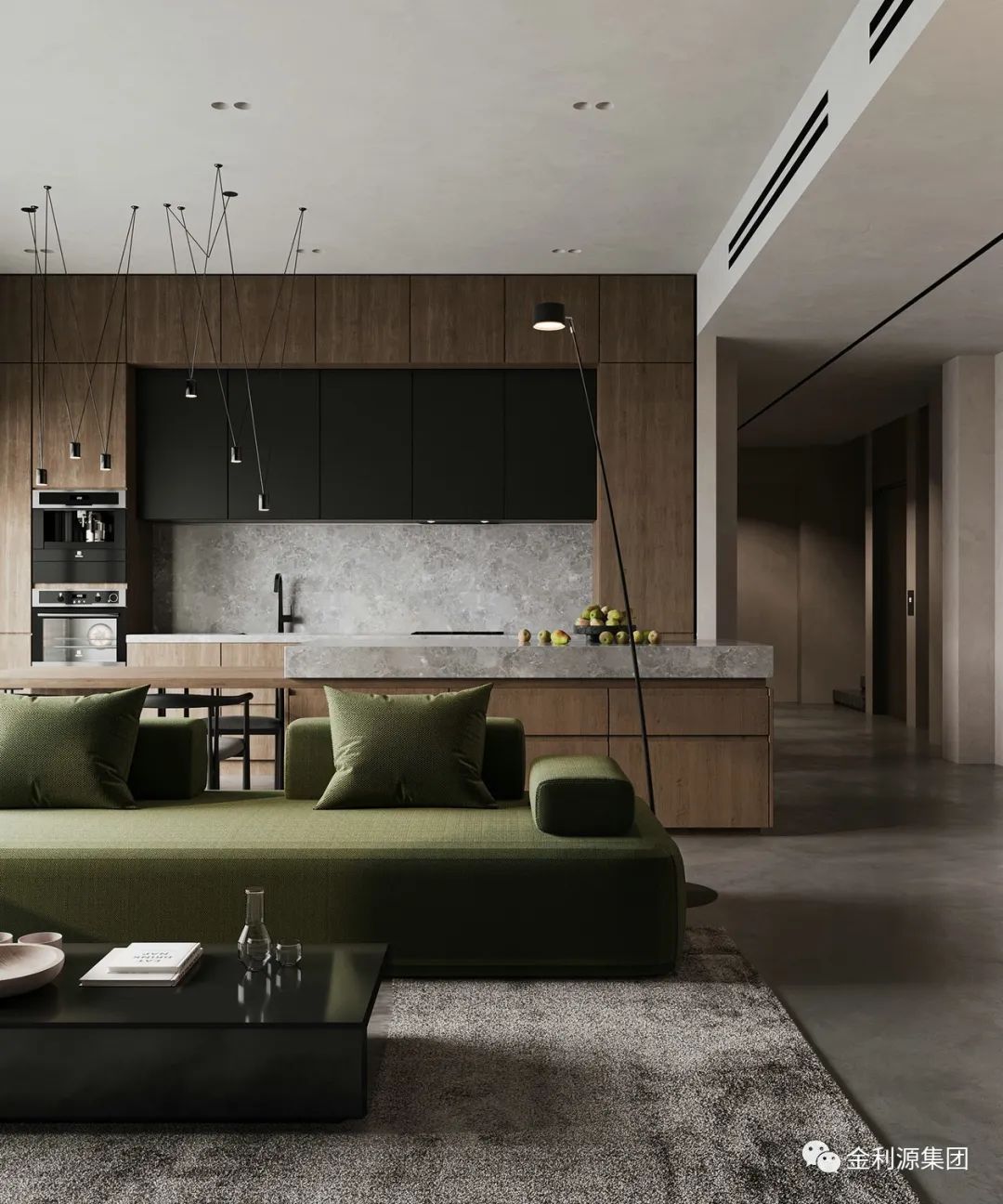 開放式結(jié)構(gòu),客餐廚一體,木色很好緩解深色沉重的空間,將所有元素收集到一個(gè)平衡點(diǎn),減少陳設(shè)的構(gòu)成元素,使得格調(diào)滿滿的,恢弘霸氣。