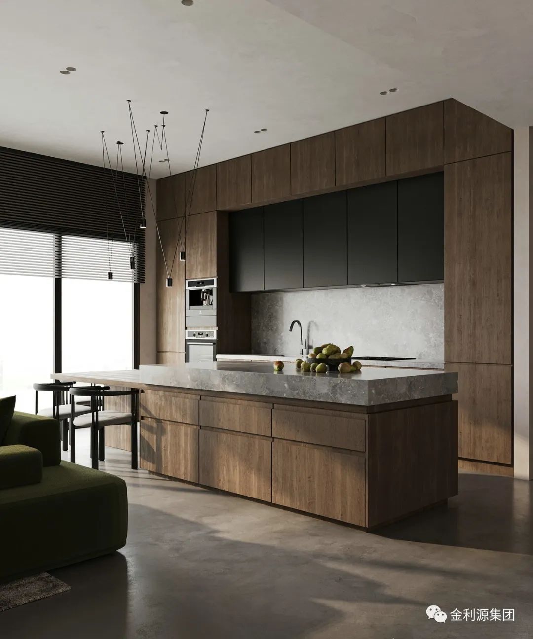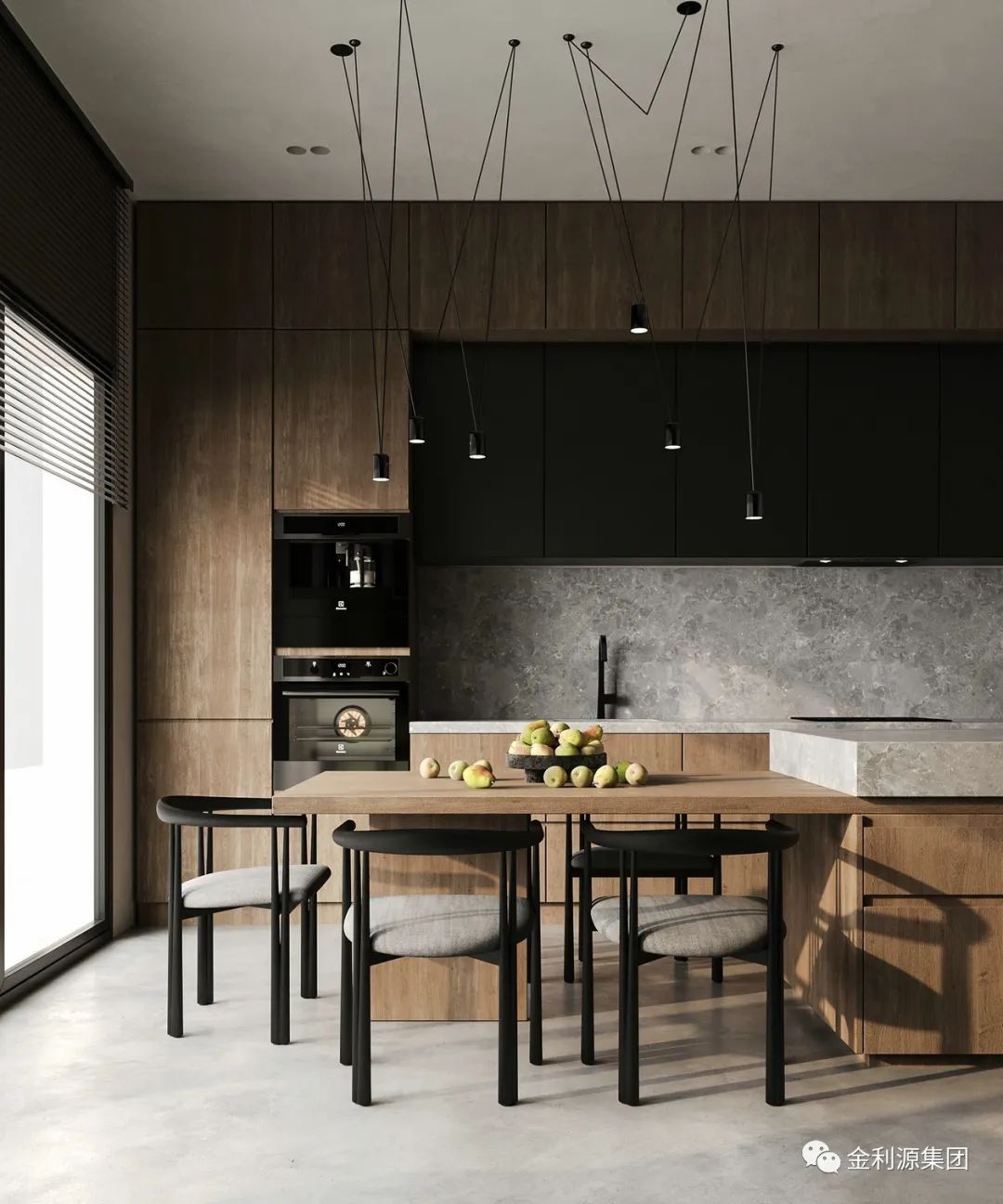 廚房位于休息區(qū)的一側(cè),櫥柜與島臺(tái)同樣使用原木與黑色配色,櫥柜下方散發(fā)出燈光,為空間增添暖意的同時(shí)拉闊了視覺的延伸感。生態(tài)板—金利源板材