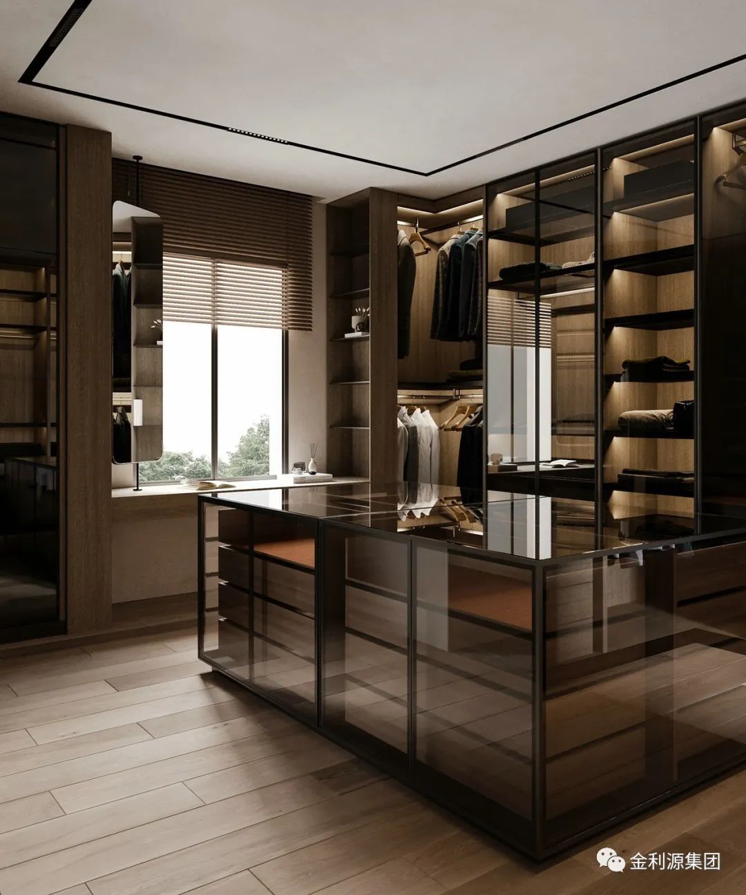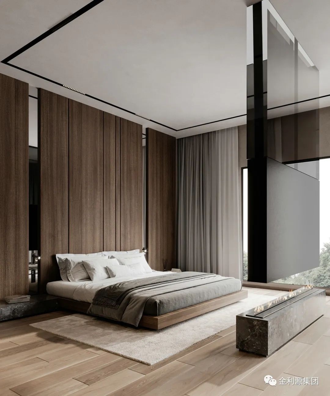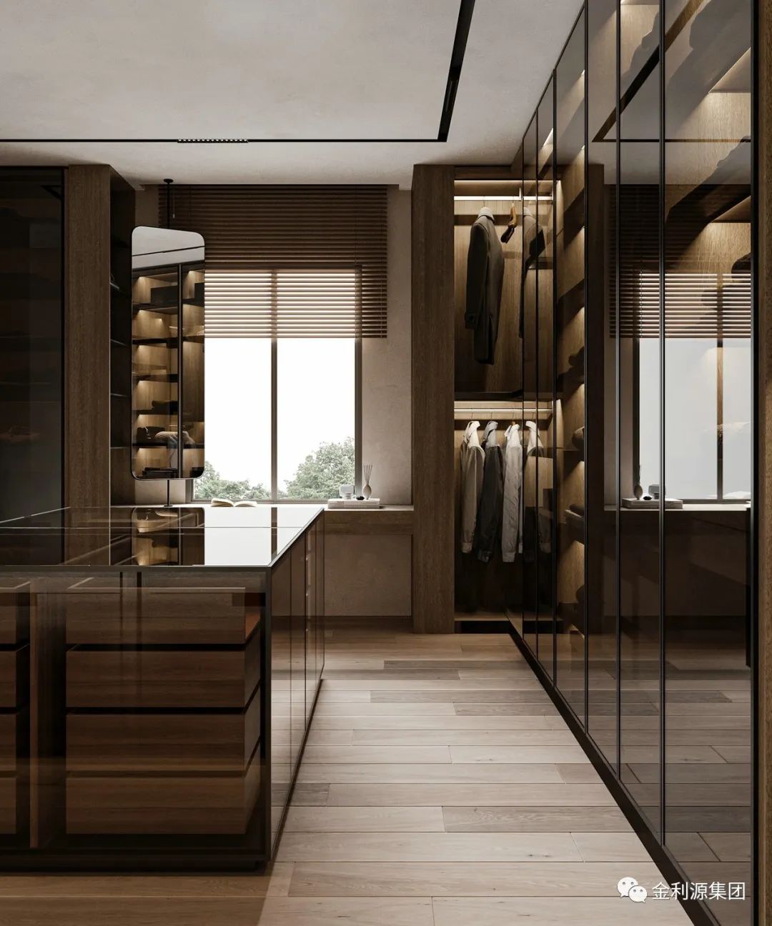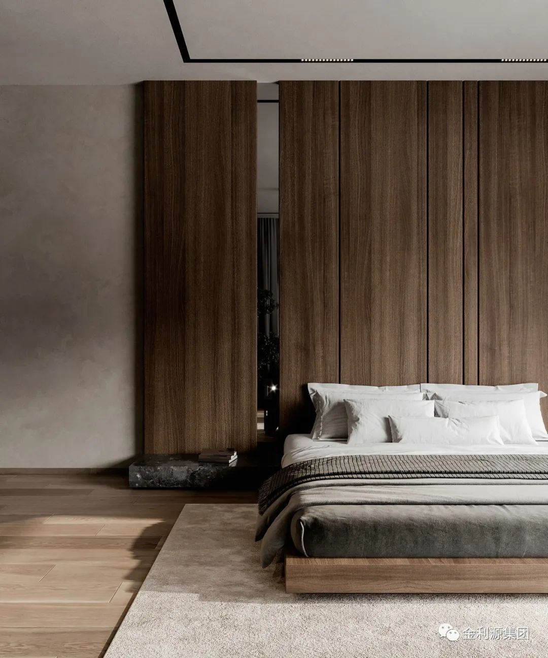 主臥沒有復(fù)雜的設(shè)計(jì),簡簡單單的線條營造美感與遐想。步入式衣帽間的設(shè)計(jì),將收納能力做到最大化。背景墻用木飾面與黑色搭配為主,時(shí)尚又不失質(zhì)感。板材品牌有哪些—金利源板材