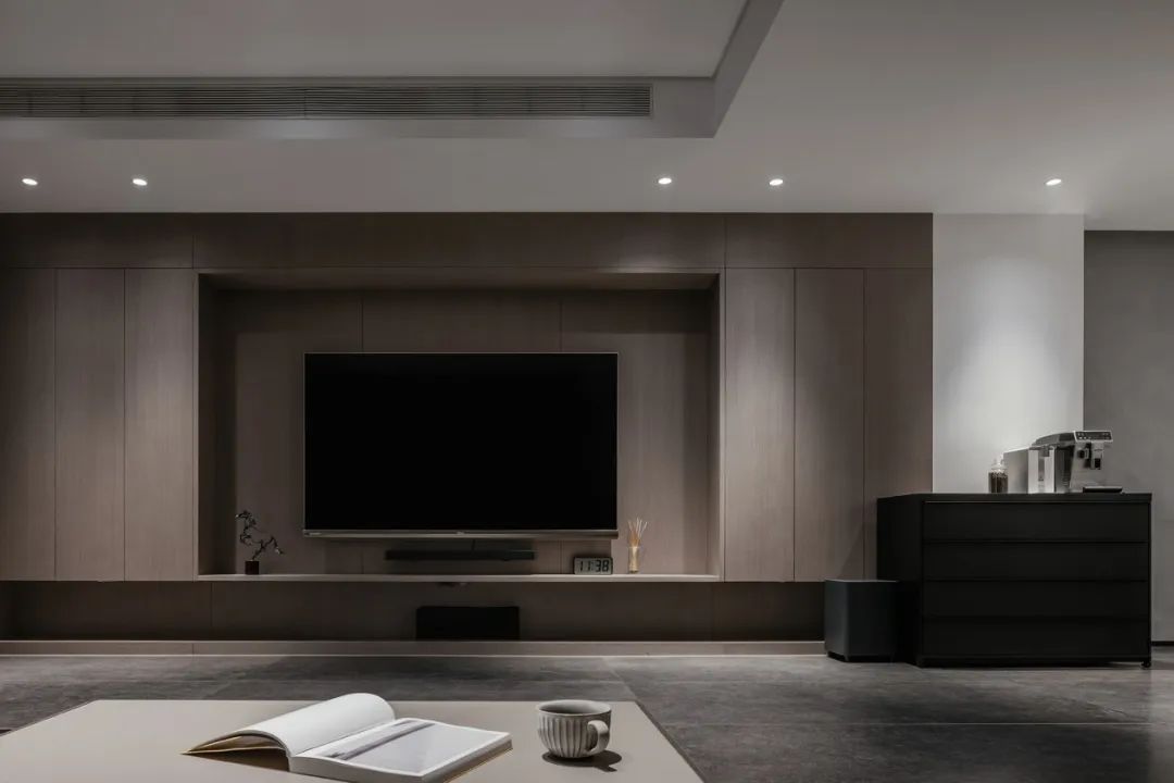 運用利落有致的凹凸手法,輔以暖系原木,既能突出電視屏幕里的精彩畫面,又可以借助背景柔和自然的視覺觀感,緩解視覺疲勞,達成功能與美學(xué)的巧妙融合。
