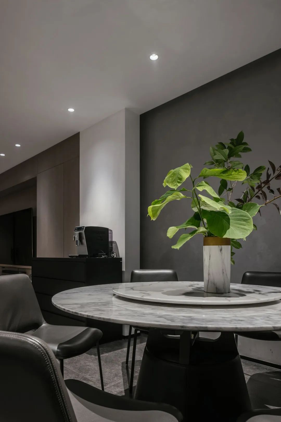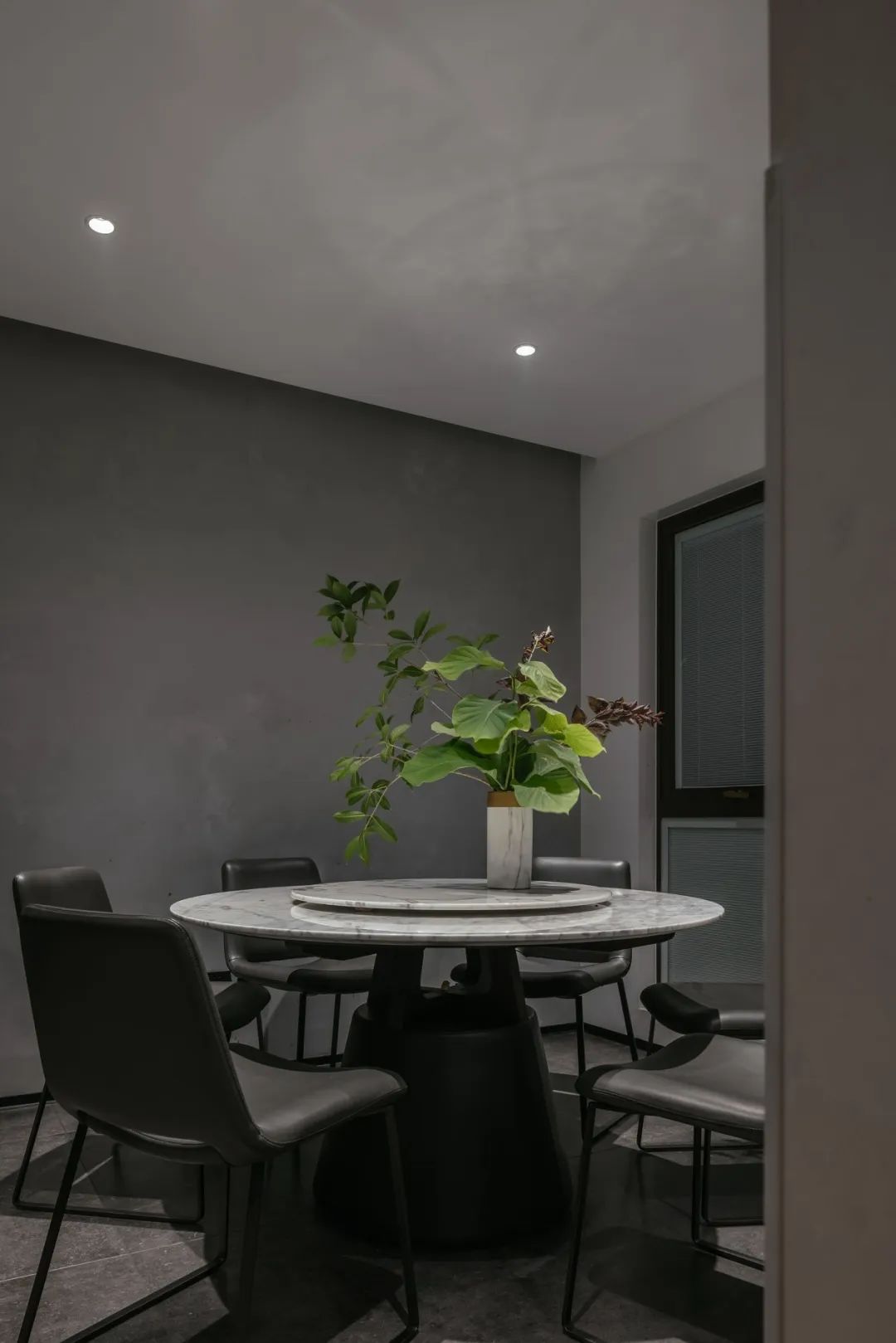 選用三種色塊相互穿插、疊層、造型,發(fā)揮過渡之用,增添收納功能,將空間敘事引向餐廳區(qū)域。排布灰調(diào)元素,延展大理石圓桌,點染一抹青綠,不多不少,為聚餐時光預(yù)留了無限的可能性。