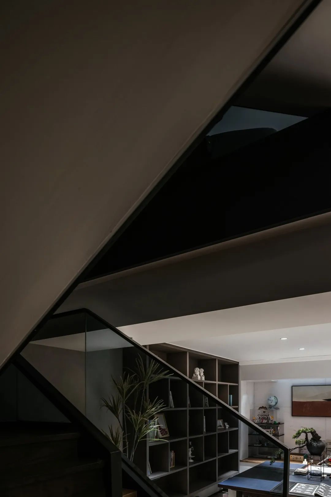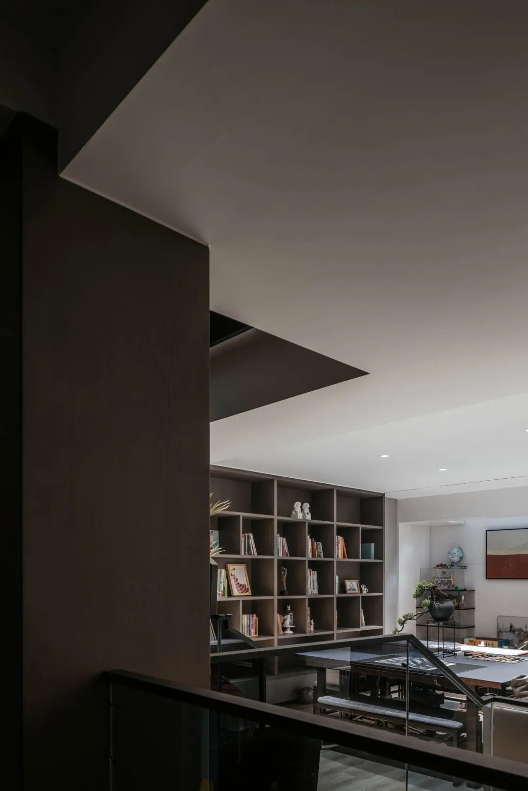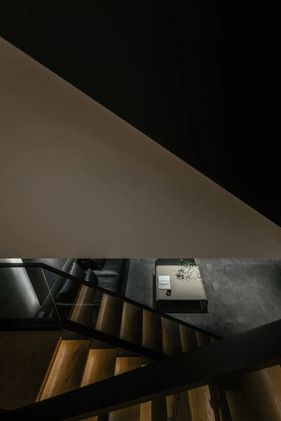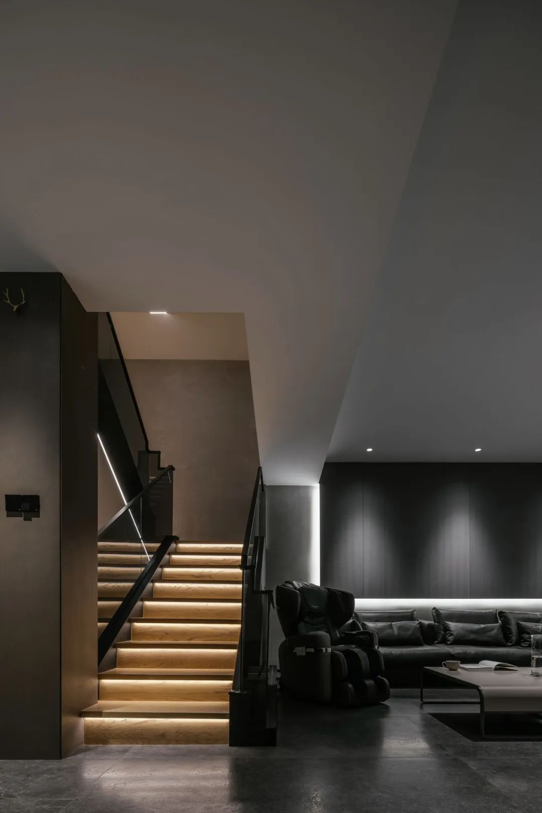 通過冷光碰撞暖光的張力,強調(diào)樓梯的獨立型格,根據(jù)階梯的數(shù)量與尺度,糅合透明圍欄,呼應(yīng)著全域空間的暗色基調(diào),渲染出動人的詩意筆法。免漆生態(tài)板品牌—金利源板材