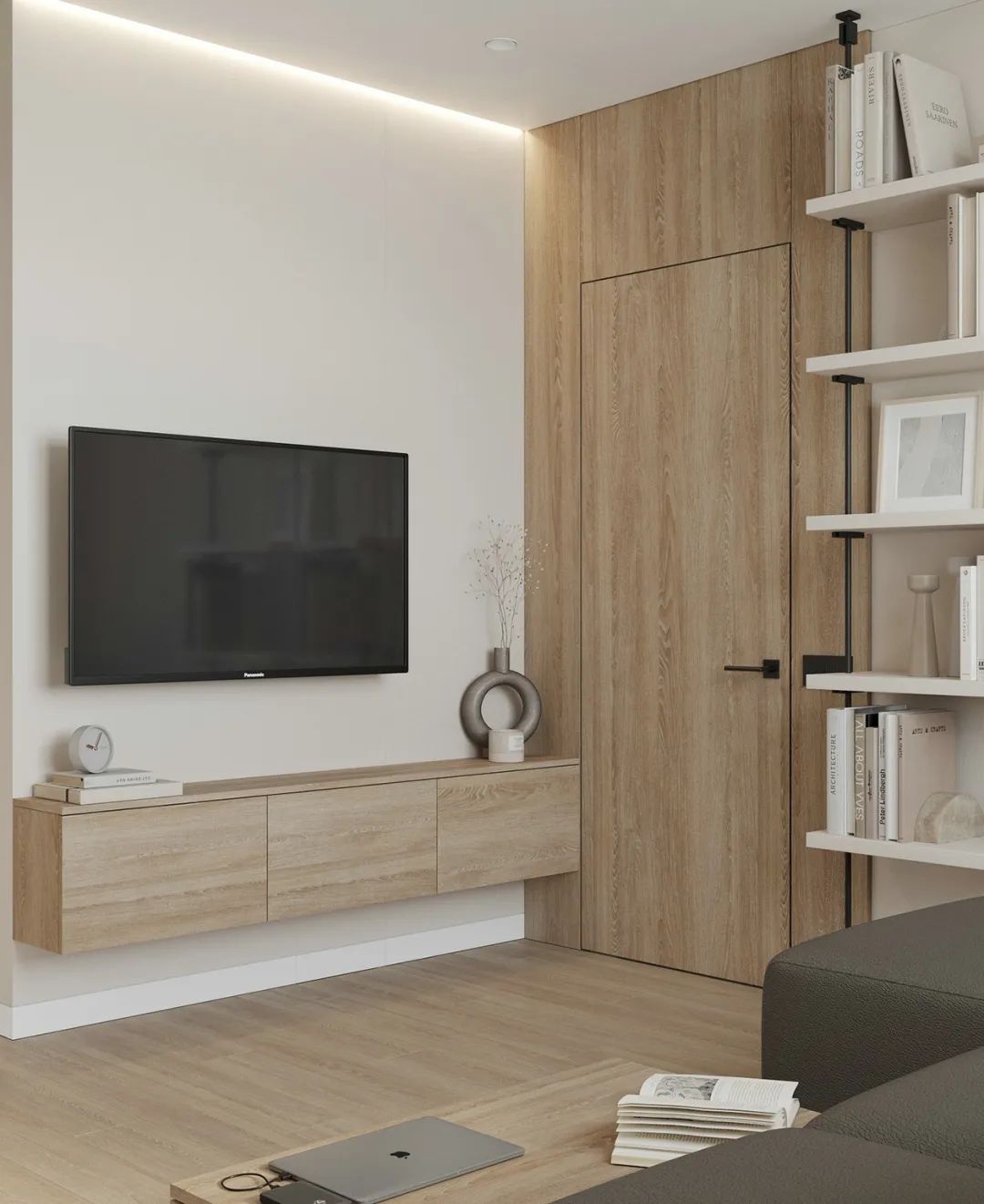 淺色的墻面搭上原木色的地板、軟裝家居,色彩協(xié)調(diào),在視覺(jué)上給人一種帶給人干凈明朗的感覺(jué)。