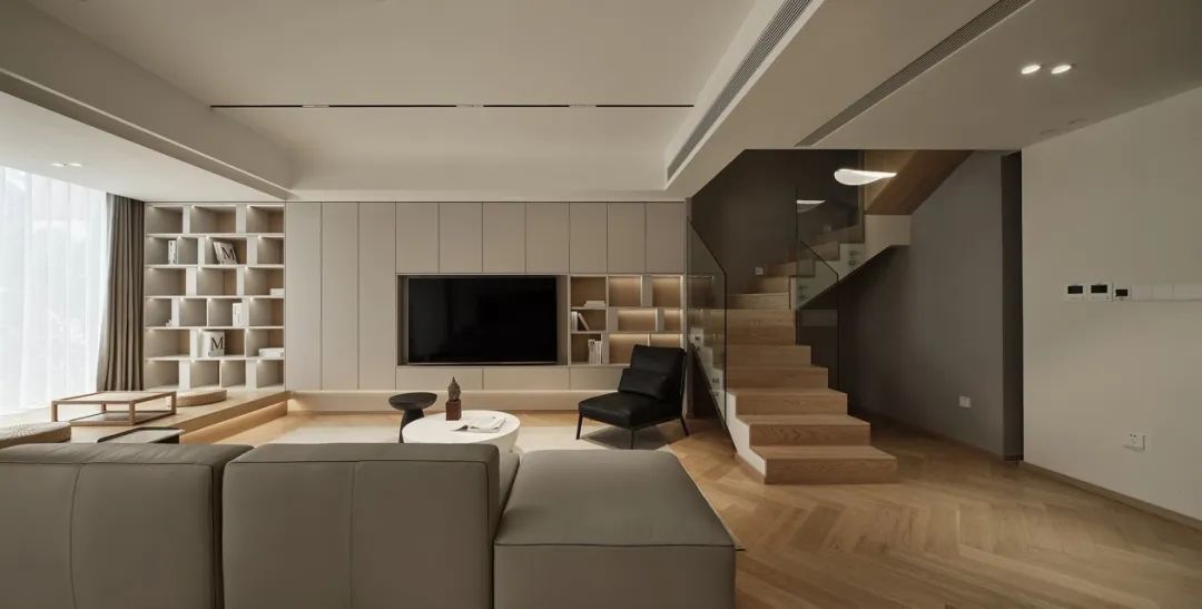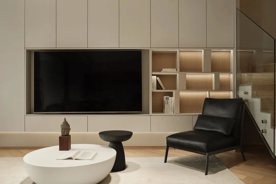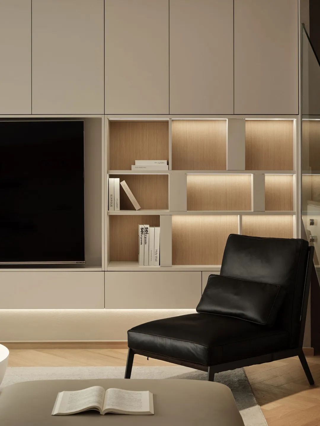 賦予空間敘事更強的光影美感,在體塊合圍之下促成空間的交互,增強了一域多用的可能性,拓展自由感的視覺表達與空間呈現(xiàn)。將科學性與美學性融入電視背景墻,展露一重一輕、一簡一繁的設計思想。