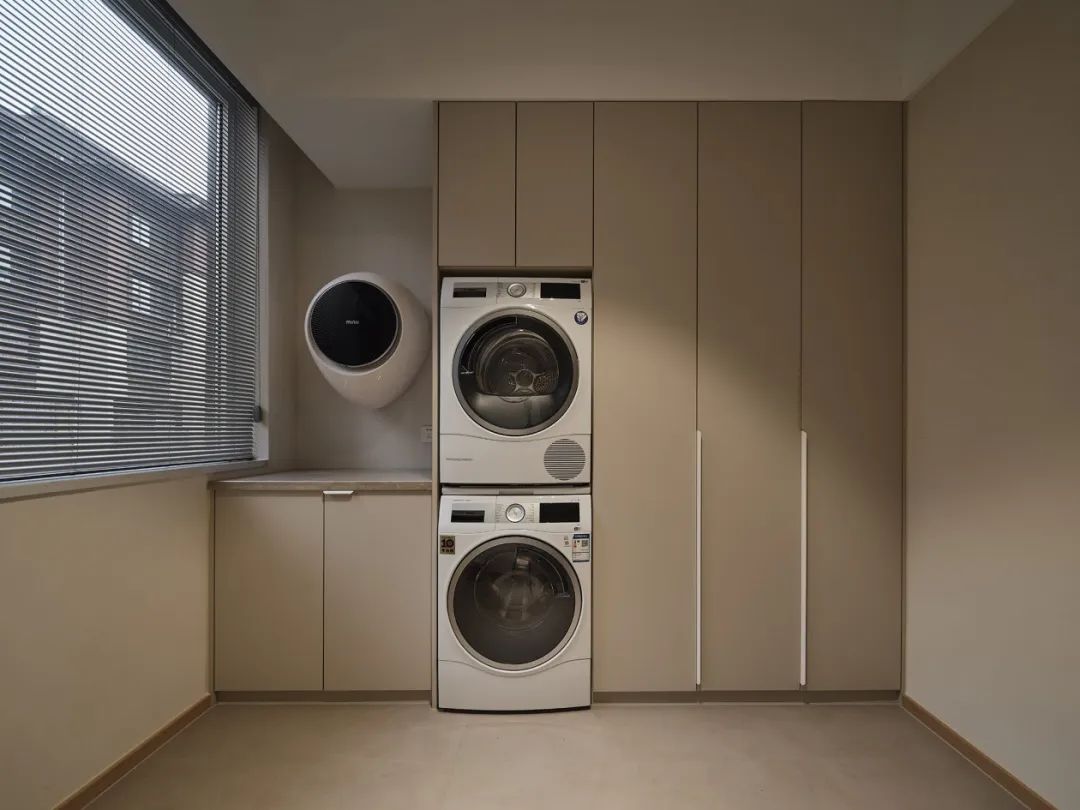 根據(jù)空間尺度與電器造型,塑造集收納、擺置、清洗、烘干、晾曬于一體的洗衣房,采用中性色維穩(wěn)整體氣質。全屋定制板材—金利源板材