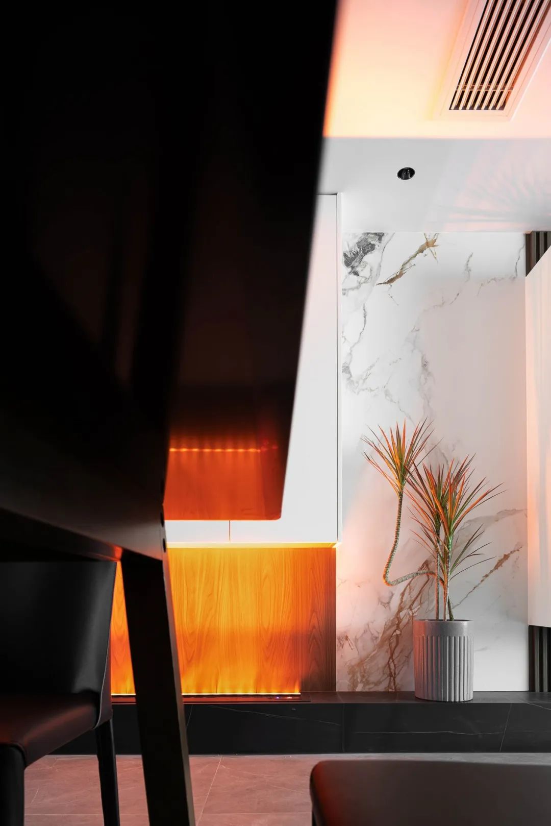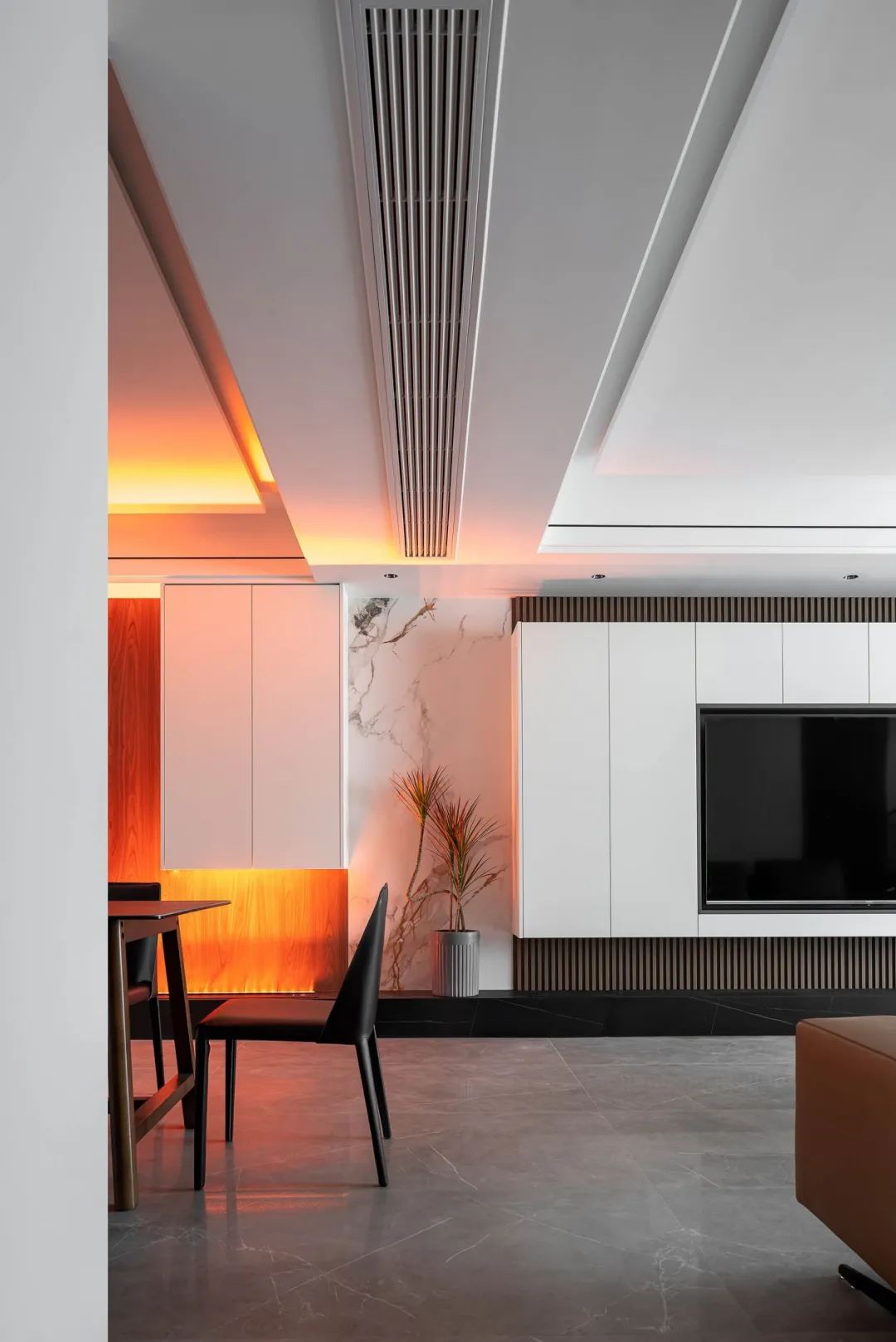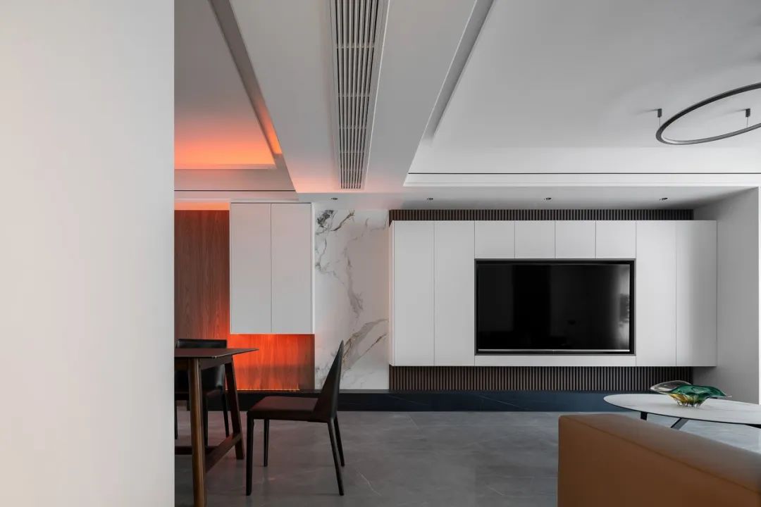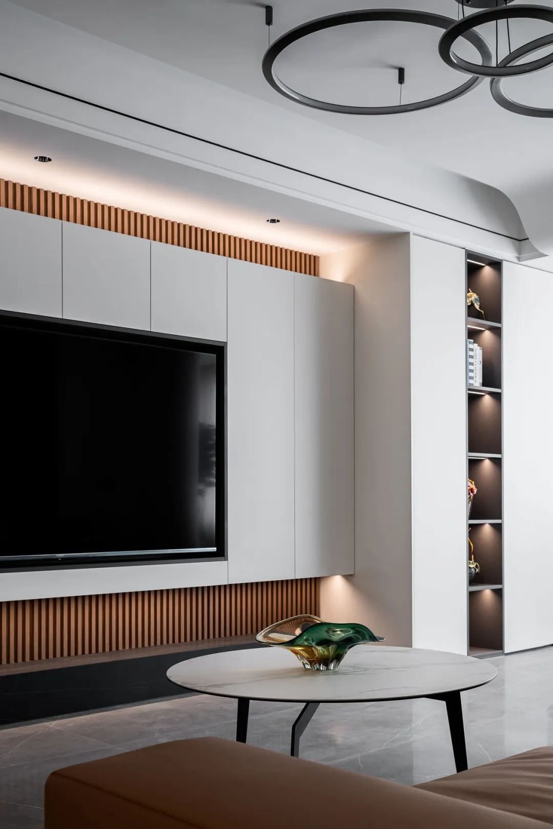 將功能性糅進整體美學,促成轉折面之間的自然互動,保留簡潔色調(diào),描摹氤氳紋理,過渡主次場域。以金利源板材重色格柵為背景,疊加純白體塊作隱藏收納,內(nèi)嵌電視屏幕,展露出凹凸有致、韻律優(yōu)美的簡雅氣質(zhì)。