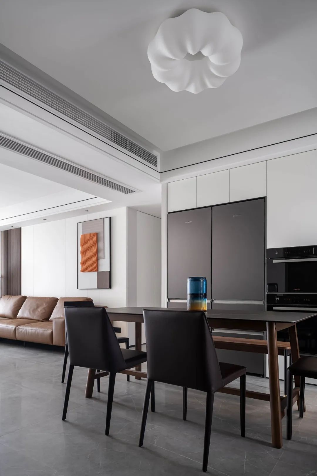暖融壁爐與沙發(fā)后的裝飾畫以相望的形式隔空對話,一邊連接植物營造自然之境,一邊映襯溫馨的就餐情景。