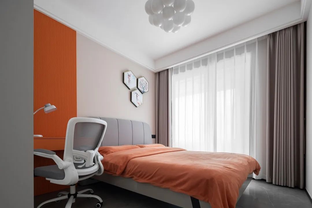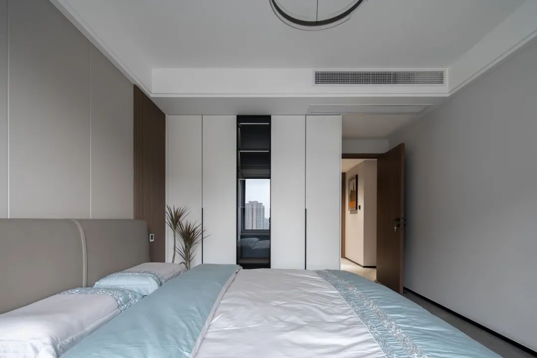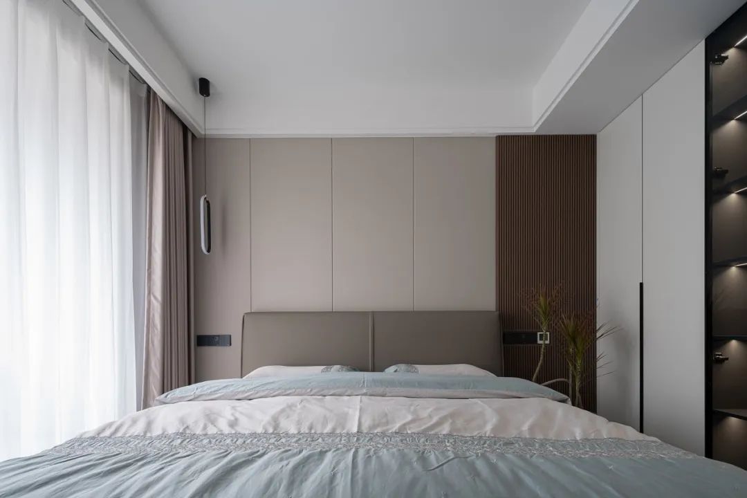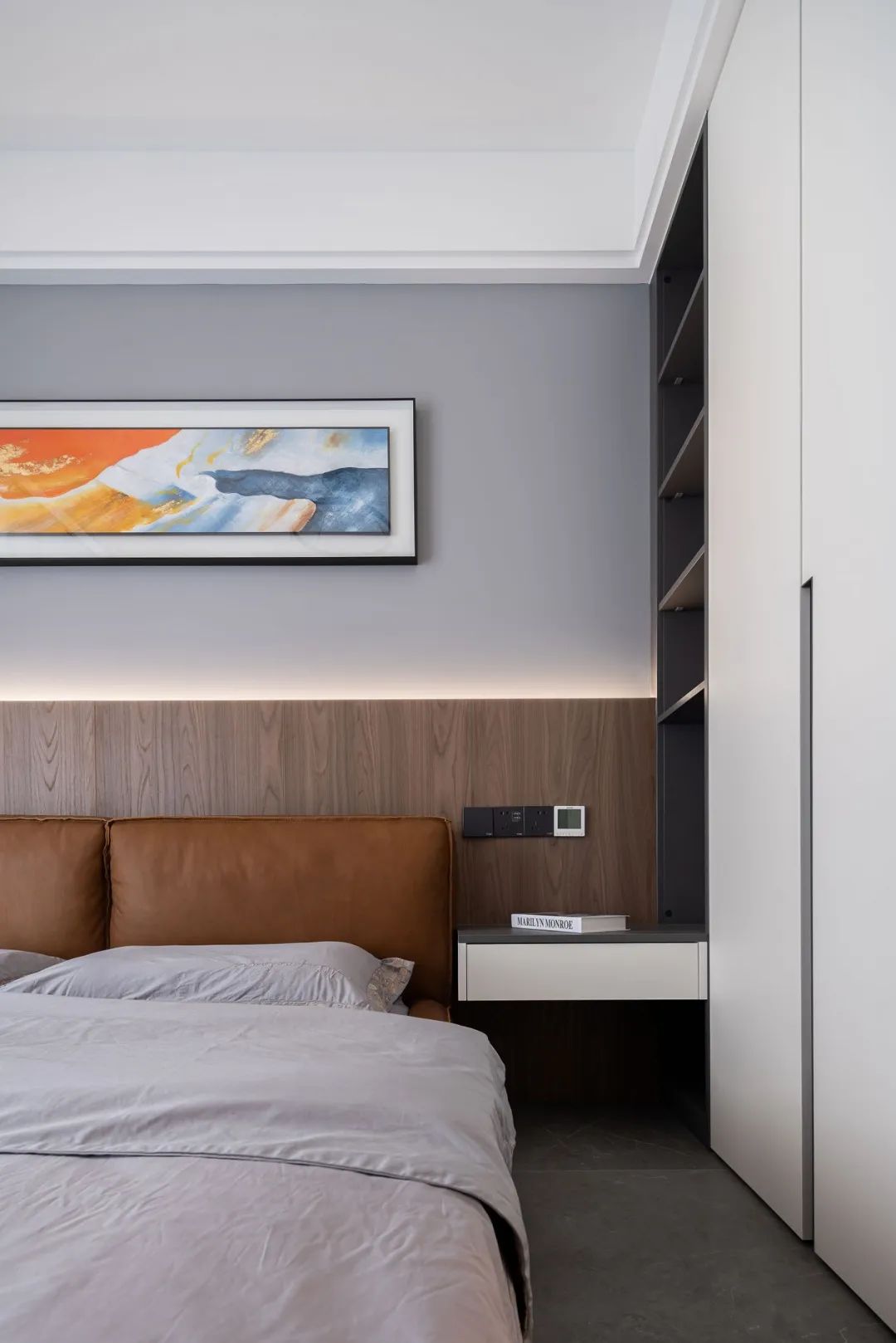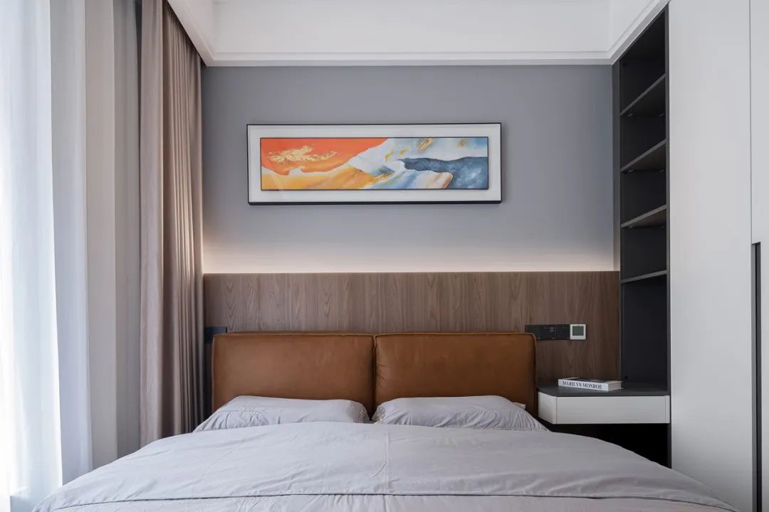 采用對半分割形態(tài),定義睡臥區(qū)域與裝飾區(qū)域,色彩經(jīng)過冷調(diào)的過濾,繪就出浪漫之境,邂逅暖調(diào)的金利源板材與皮革,讓悠然沉靜的氣質(zhì)逐漸豐盈,懸空造型與線型光暈呼應,構成生趣的視覺表達。免漆生態(tài)板品牌—金利源板材