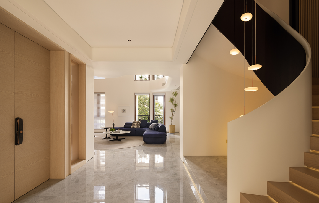 從玄關(guān)進(jìn)入,弧形的旋轉(zhuǎn)樓梯增加了空間的流動(dòng)感,讓進(jìn)入空間的人能夠直觀感受到線條之美。