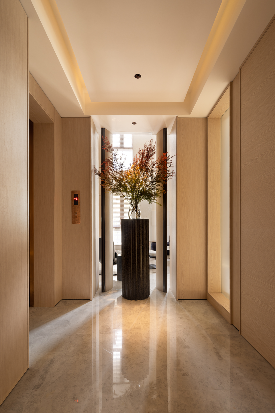 開(kāi)門(mén)見(jiàn)景,藝術(shù)的裝飾品與植物的擺放為玄關(guān)增添了質(zhì)樸之美,強(qiáng)化了歸家的儀式感,在細(xì)節(jié)及尺度上的考量之下,表達(dá)出對(duì)居住者身份的尊重。